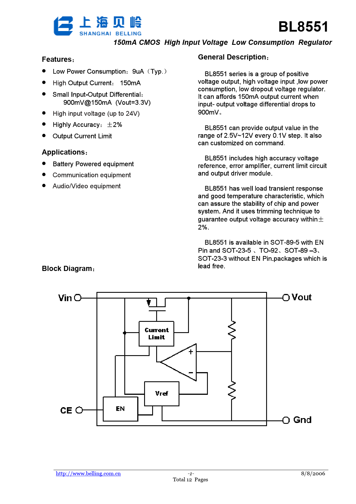 BL8551 150mA CMOS High Input Voltage Low Consumption Regulator General Description Features Applications Block Diagram http://www.belling.com.cn -1- 8/8/2006 Total 12 Pages