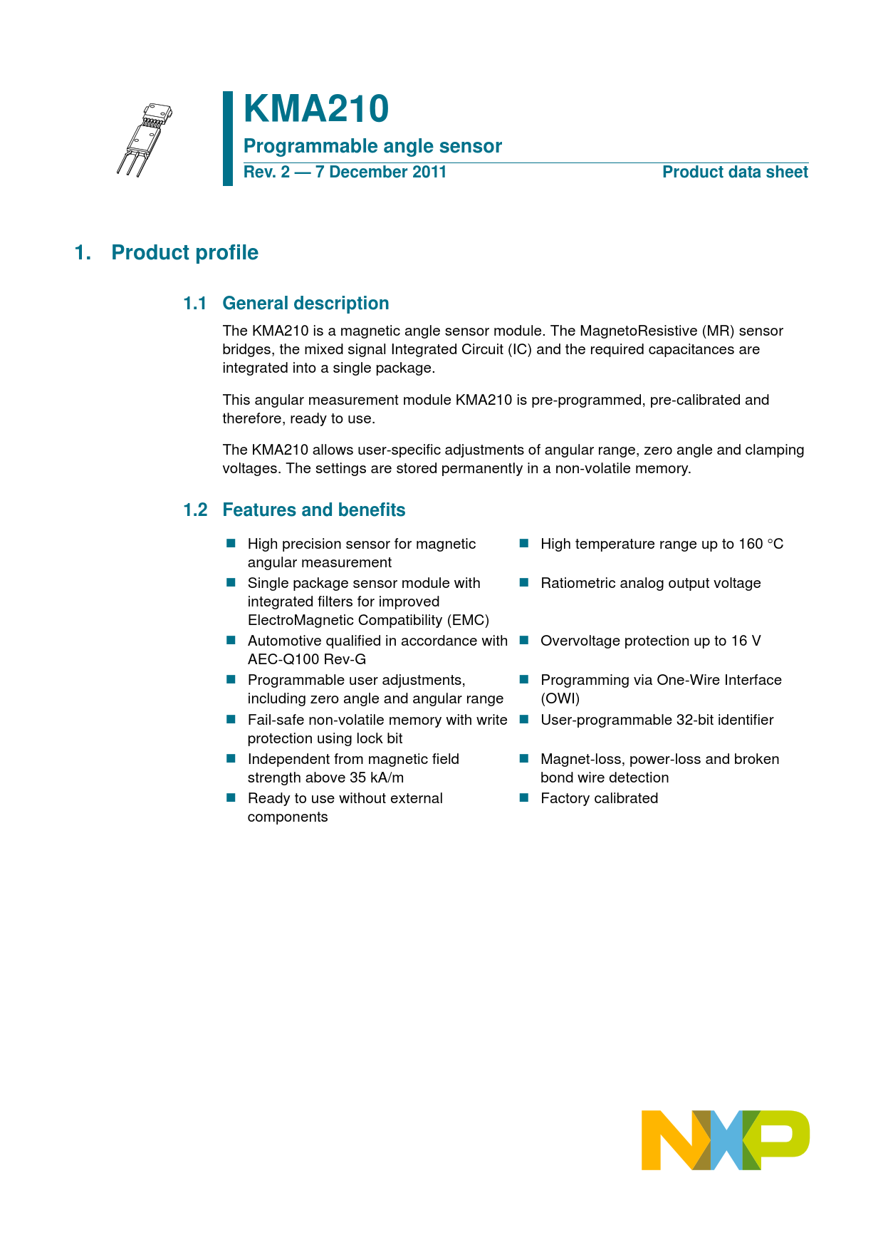 KMA210 Programmable angle sensorRev. 2 — 7 December 2011Product data sheet1. Productprofile1.1 General description The KMA210 is a magnetic angle sensor module. The MagnetoResistive (MR) sensor bridges, the mixed signal Integrated Circuit (IC) and the required capacitances are integrated into a single package. This angular measurement module KMA210 is pre-programmed, pre-calibrated and therefore, ready to use. The KMA210 allows user-specific adjustments of angular range, zero angle and clamping voltages. The settings are stored permanently in a non-volatile memory. 1.2 Features and benefits High precision sensor for magnetic High temperature range up to 160 C angular measurement Single package sensor module with Ratiometric analog output voltage integrated filters for improved ElectroMagnetic Compatibility (EMC) Automotive qualified in accordance with Overvoltage protection up to 16 V AEC-Q100 Rev-G Programmable user adjustments, Programming via One-Wire Interface including zero angle and angular range (OWI) Fail-safe non-volatile memory with write User-programmable 32-bit identifier protection using lock bit Independent from magnetic field Magnet-loss, power-loss and broken strength above 35 kA/m bond wire detection Ready to use without external Factory calibrated components Document Outline 1. Product profile 1.1 General description 1.2 Features and benefits 2. Pinning information 3. Ordering information 4. Functional diagram 5. Functional description 5.1 Angular measurement directions 6. Analog output 7. Diagnostic features 7.1 CRC and EDC supervision 7.2 Magnet-loss detection 7.3 Power-loss detection 7.4 Broken bond wire detection 7.5 Low supply voltage detection and overvoltage protection 8. Limiting values 9. Recommended operating conditions 10. Thermal characteristics 11. Characteristics 12. Definition of errors 12.1 General 12.2 Hysteresis error 12.3 Linearity error 12.4 Microlinearity error 12.5 Temperature drift error 12.6 Angular error 13. Programming 13.1 General description 13.2 Timing characteristics 13.3 Sending and receiving data 13.3.1 Write access 13.3.2 Read access 13.3.3 Entering the command mode 13.4 Cyclic redundancy check 13.4.1 Software example in C 13.5 Registers 13.5.1 Command registers 13.5.2 Non-volatile memory registers 14. Electromagnetic compatibility 14.1 Emission (CISPR 25) 14.1.1 Conducted radio disturbance 14.1.2 Radiated radio disturbance 14.2 Radiated disturbances (ISO 11452-1 third edition (2005-02), ISO 11452-2, ISO 11452-4 and ISO 11452-5) 14.2.1 Absorber lined shielded enclosure 14.2.2 Bulk-current injection 14.2.3 Strip line 14.2.4 Immunity against mobile phones 14.3 Electrical transient transmission by capacitive coupling [ISO 7637-3, second edition (2007-07)] 15. ElectroStatic Discharge (ESD) 15.1 Human body model (AEC-Q100-002) 15.2 Human metal model (ANSI/ESD SP5.6-2009) 15.3 Machine model (AEC-Q100-003) 15.4 Charged-device model (AEC-Q100-011) 16. Application information 17. Test information 17.1 Quality information 18. Marking 19. Terminals 20. Package outline 21. Handling information 22. Solderability information 23. Revision history 24. Legal information 24.1 Data sheet status 24.2 Definitions 24.3 Disclaimers 24.4 Trademarks 25. Contact information 26. Contents