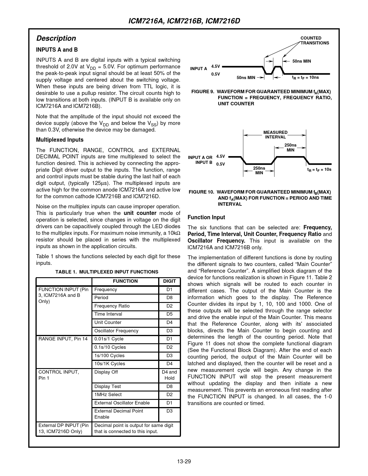 ICM7216A, ICM7216B, ICM7216D. Description. COUNTED TRANSITIONS. INPUTS A and B. 50ns MIN. 4.5V. INPUT A. 0.5V. tR = tF = 10ns