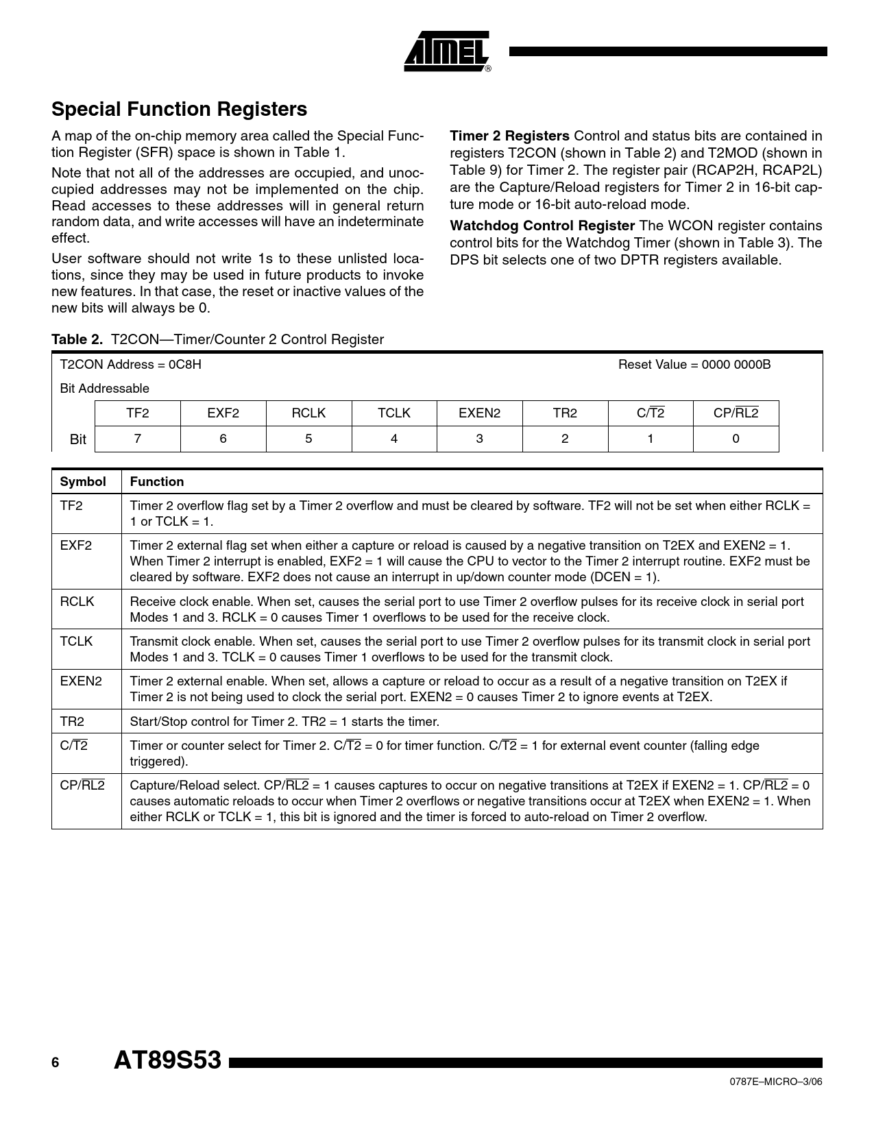 Special Function Registers. Timer 2 Registers. Watchdog Control Register. Table 2. Symbol. Function. AT89S53