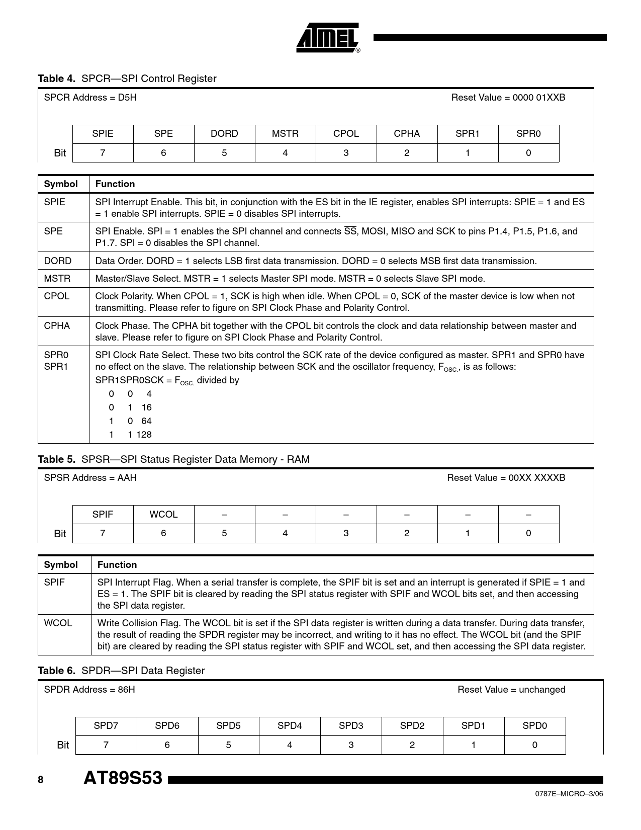 Table 4. Symbol. Function. Table 5. Table 6. AT89S53