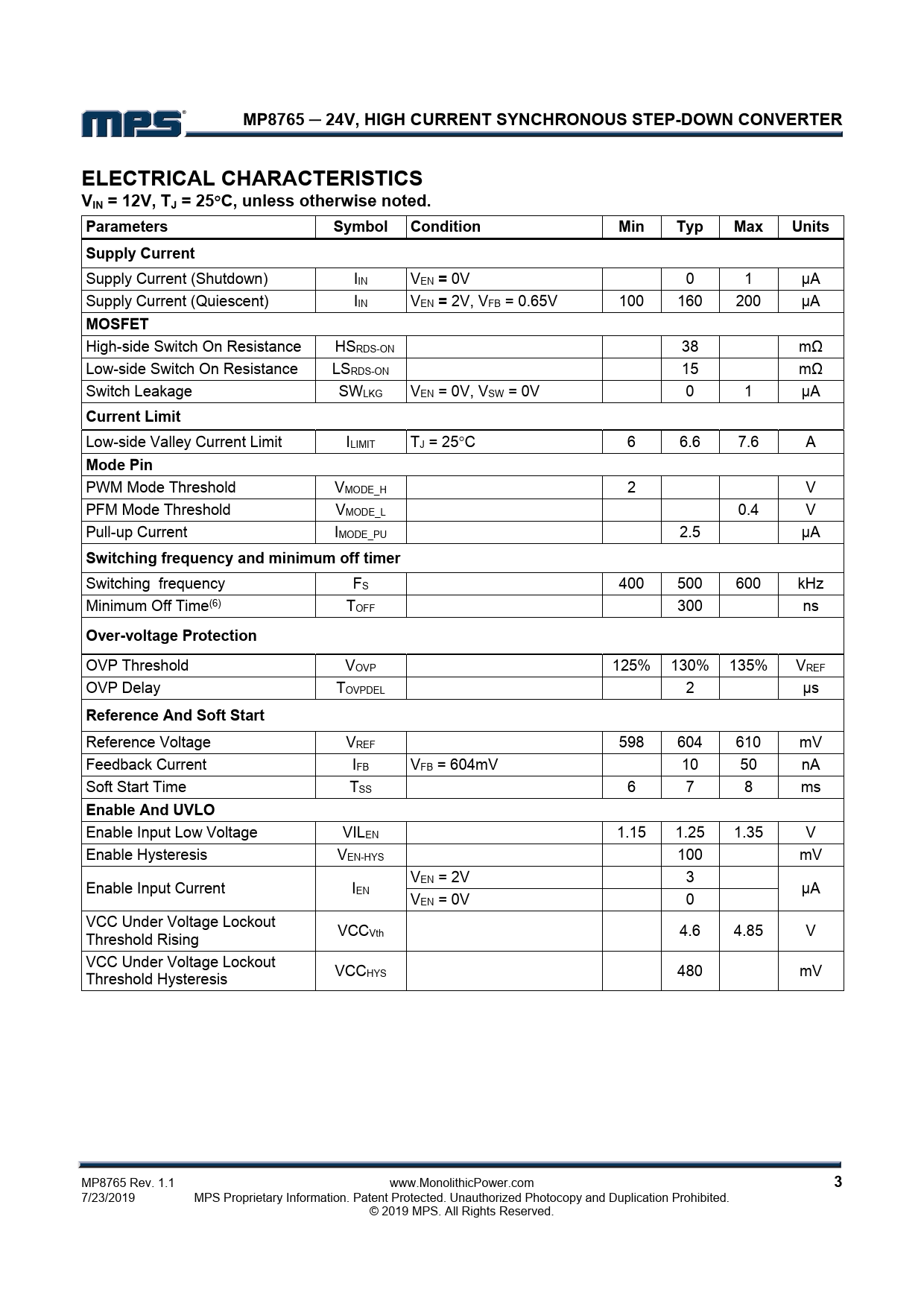 MP8765 ─ 24V, HIGH CURRENT SYNCHRONOUS STEP-DOWN CONVERTER. ELECTRICAL CHARACTERISTICS VIN = 12V, TJ = 25