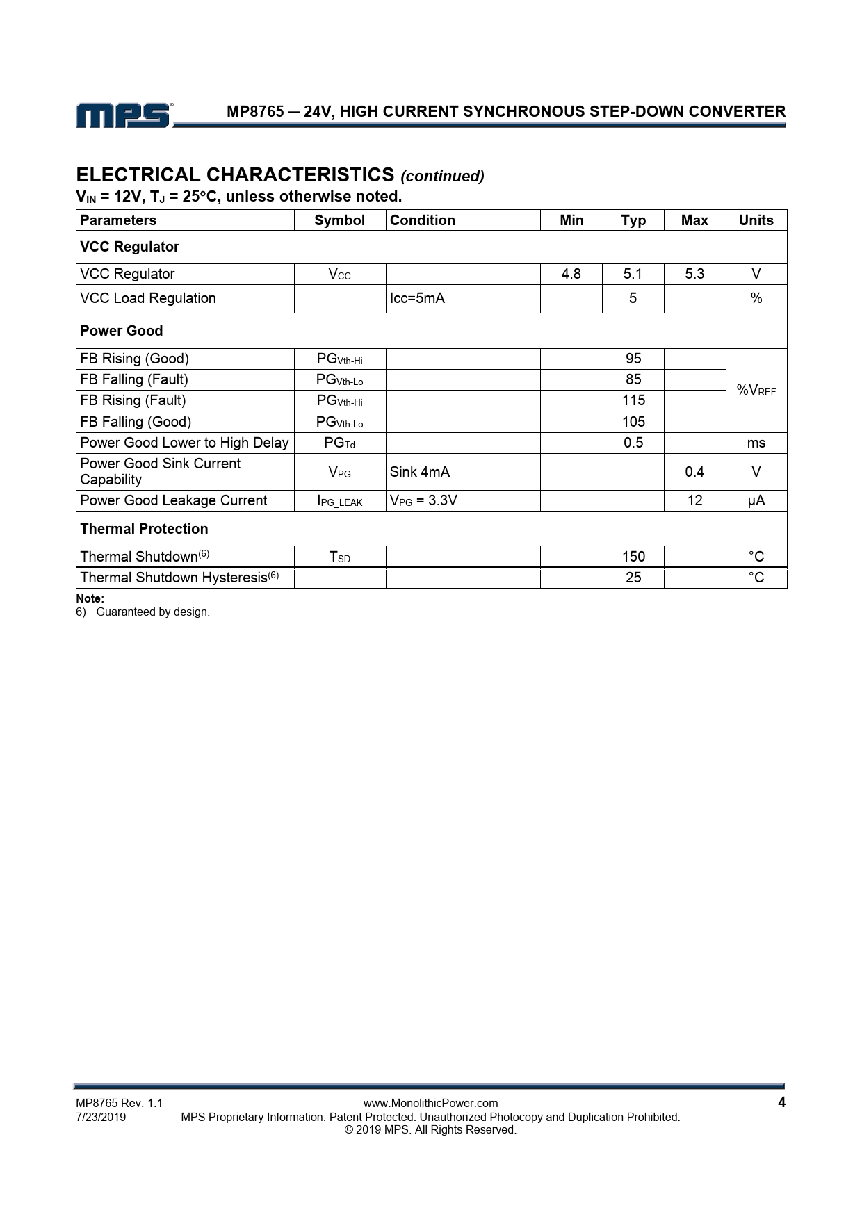 MP8765 ─ 24V, HIGH CURRENT SYNCHRONOUS STEP-DOWN CONVERTER. ELECTRICAL CHARACTERISTICS (continued). VIN = 12V, TJ = 25