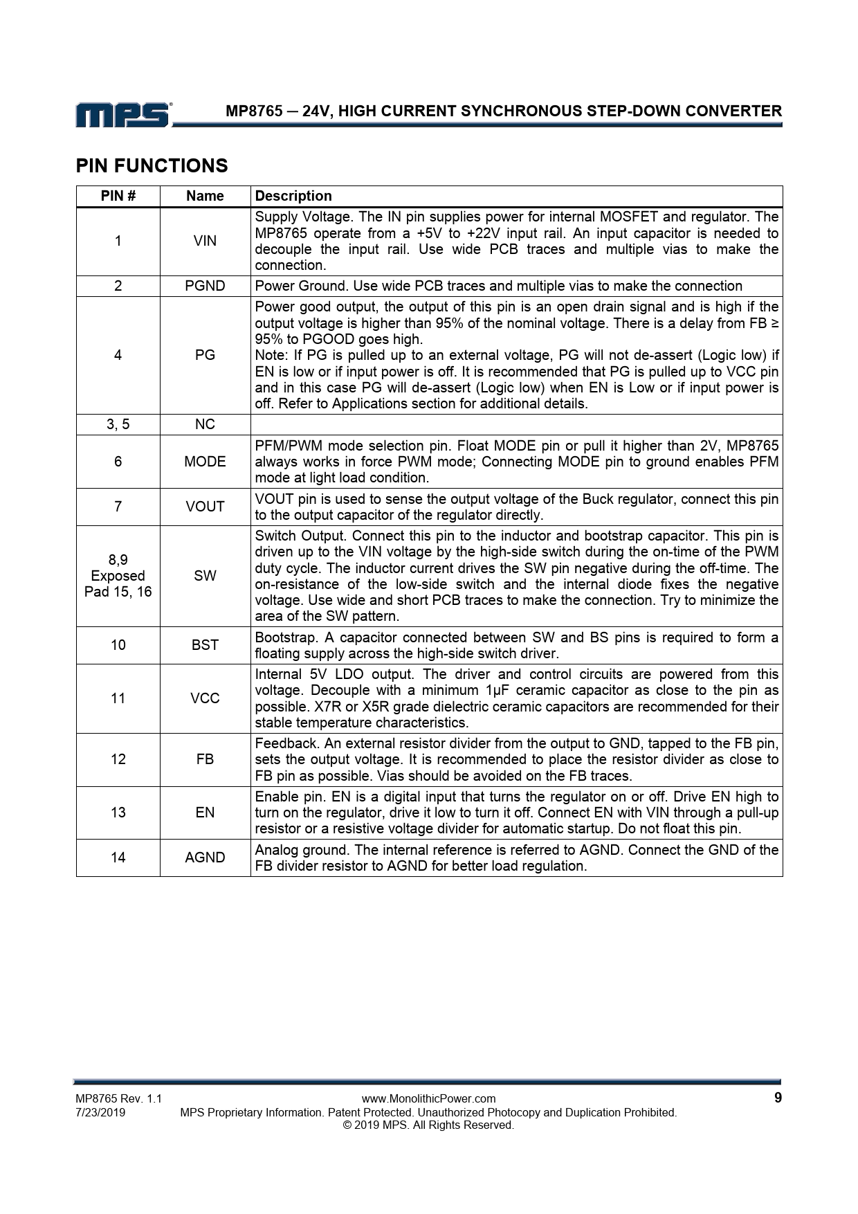 | Pages / Page | 21 / 9 — MP8765 ─ 24V, HIGH CURRENT SYNCHRONOUS STEP-DOWN CONVERTER. PIN … |