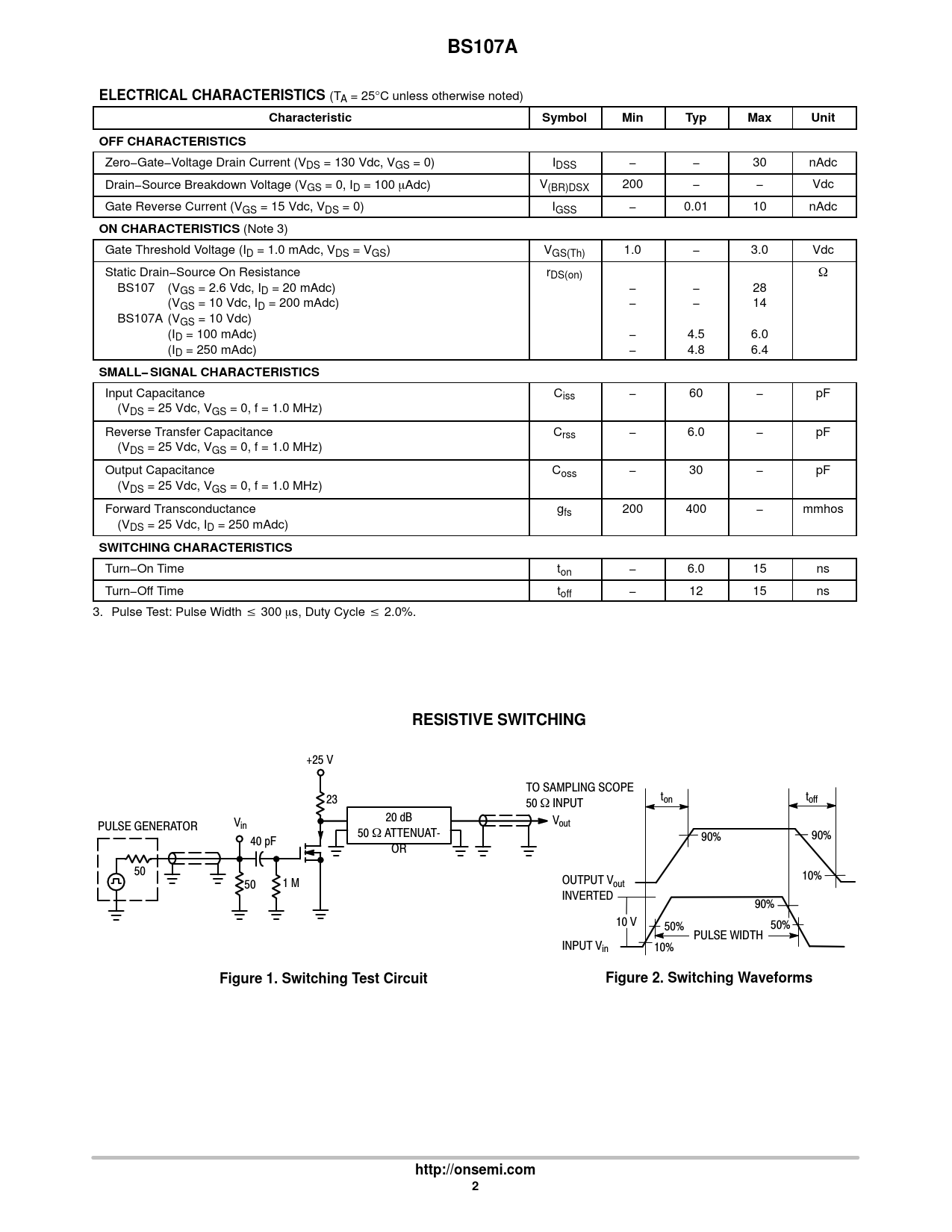 (Note 3) Gate Threshold Voltage (ID = 1.0 mAdc, VDS = VGS) VGS(Th) 1.0 − 3.0 Vdc Static Drain−Source On Resistance rDS(on) W BS107 (VGS = 2.6 Vdc, ID = 20 mAdc) − − 28 (VGS = 10 Vdc, ID = 200 mAdc) − − 14 BS107A (VGS = 10 Vdc) (ID = 100 mAdc) − 4.5 6.0 (ID = 250 mAdc) − 4.8 6.4