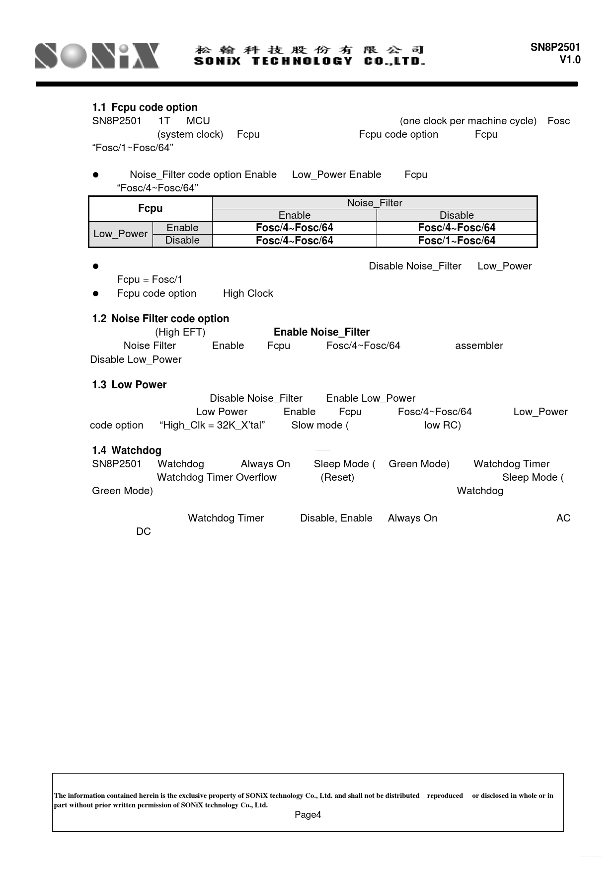 SN8P2501. V1.0. 1.1 Fcpu code option. Fcpu. Fosc/4~Fosc/64 Fosc/4~Fosc/64. Fosc/4~Fosc/64 Fosc/1~Fosc/64