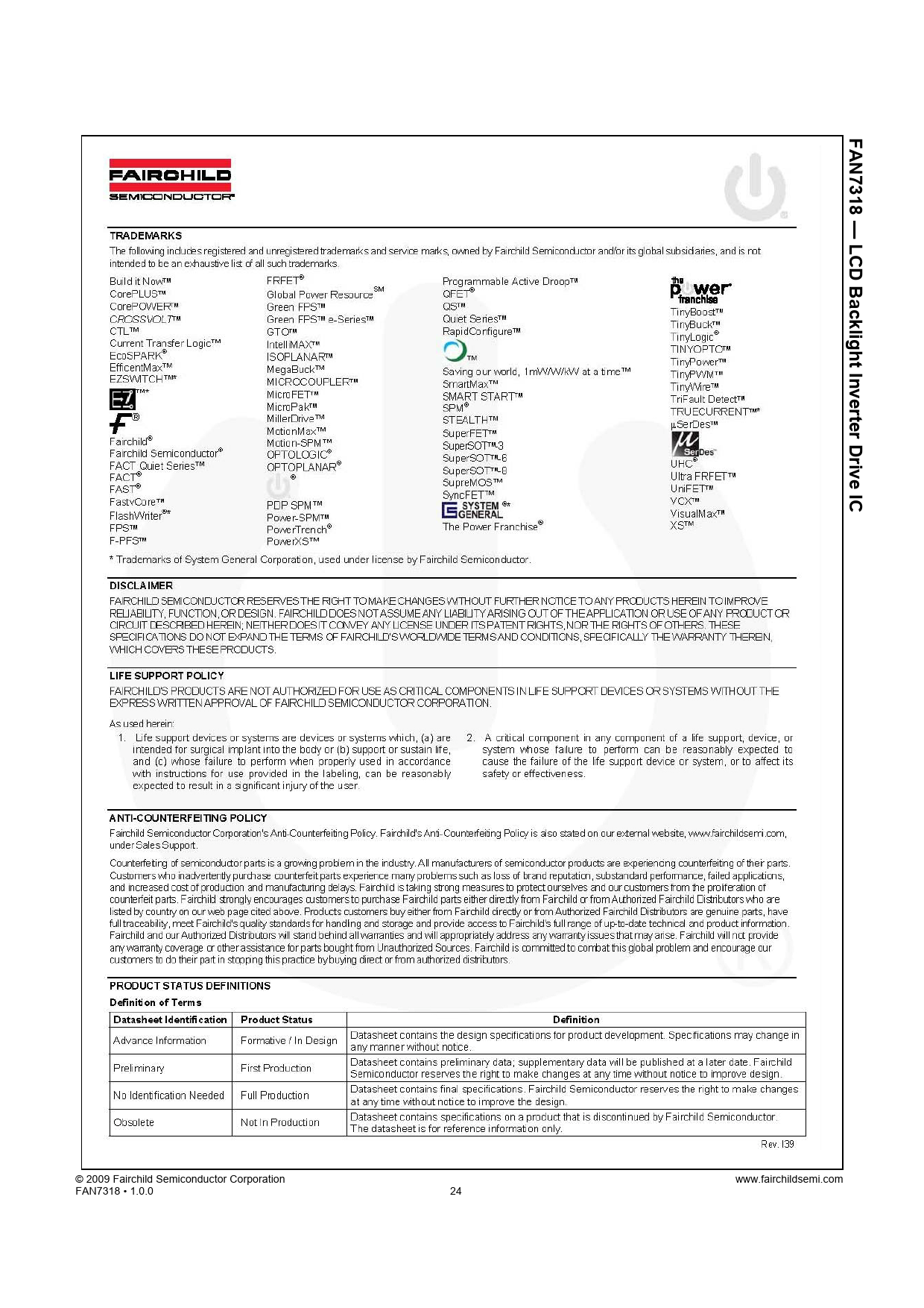 © 2009 Fairchild Semiconductor Corporation www.fairchildsemi.com FAN7318 • 1.0.0 24
