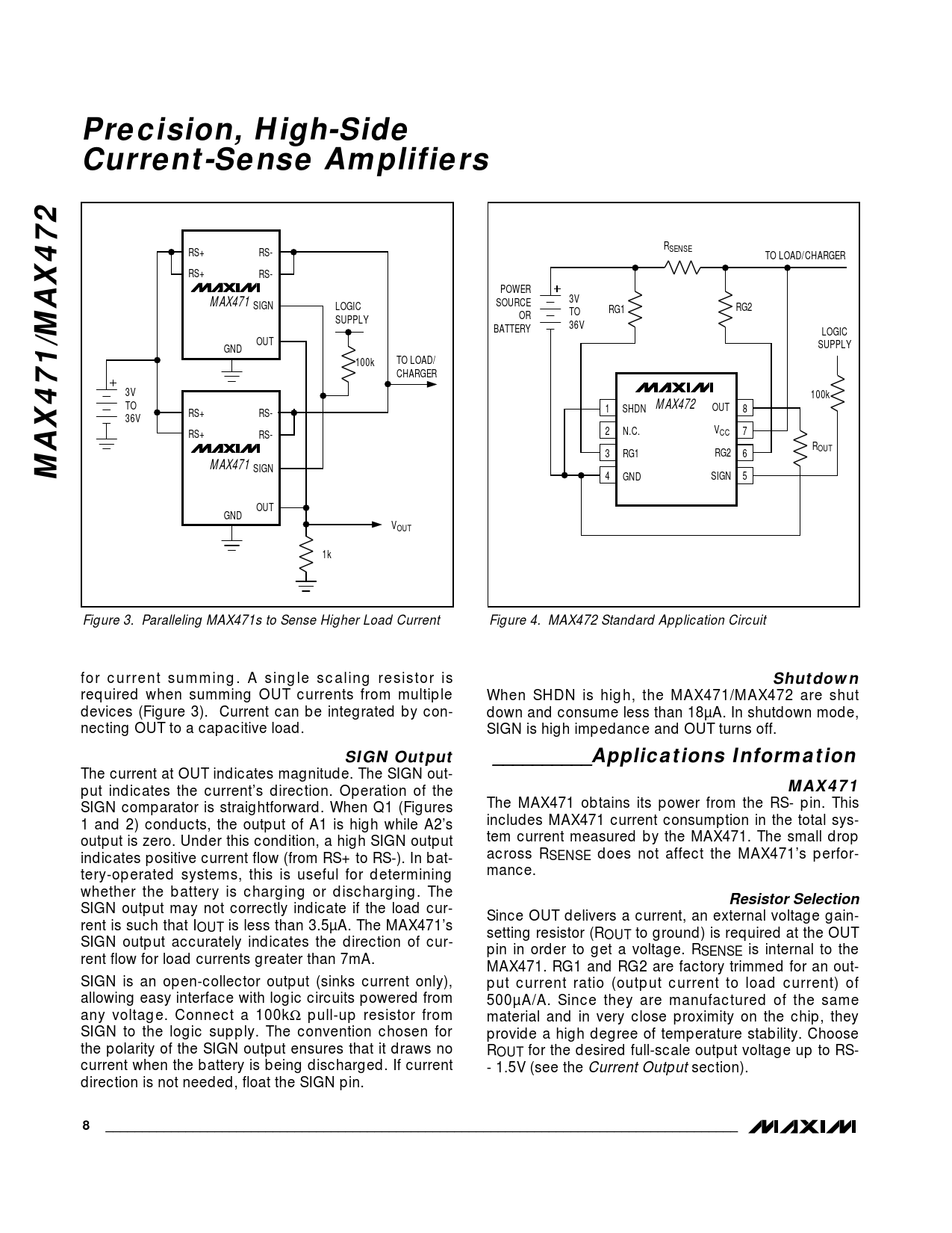 Precision, High-Side Current-Sense Amplifiers R RS+ RS- SENSE TO LOAD/CHARGER RS+ RS- POWER MAX471 3V SIGN LOGIC SOURCE TO RG2 RG1 SUPPLY OR 36V BATTERY LOGIC OUT GND SUPPLY TO LOAD/ 100k CHARGER 3V 100k TO MAX472 OUT RS+ RS- 1 SHDN 8 36V RS+ RS- 2 N.C. VCC 7 ROUT 3 RG1 RG2 6 MAX471/MAX472 MAX471 SIGN 4 GND SIGN 5 OUT GND VOUT 1k Figure 3. Paralleling MAX471s to Sense Higher Load Current Figure 4. MAX472 Standard Application Circuit for current summing. A single scaling resistor is Shutdown required when summing OUT currents from multiple When SHDN is high, the MAX471/MAX472 are shut devices (Figure 3). Current can be integrated by con- down and consume less than 18µA. In shutdown mode, necting OUT to a capacitive load. SIGN is high impedance and OUT turns off. SIGN Output__________Applications Information The current at OUT indicates magnitude. The SIGN out- put indicates the current’s direction. Operation of the MAX471 SIGN comparator is straightforward. When Q1 (Figures The MAX471 obtains its power from the RS- pin. This 1 and 2) conducts, the output of A1 is high while A2’s includes MAX471 current consumption in the total sys- output is zero. Under this condition, a high SIGN output tem current measured by the MAX471. The small drop indicates positive current flow (from RS+ to RS-). In bat- across RSENSE does not affect the MAX471’s perfor- tery-operated systems, this is useful for determining mance. whether the battery is charging or discharging. The Resistor Selection SIGN output may not correctly indicate if the load cur- Since OUT delivers a current, an external voltage gain- rent is such that IOUT is less than 3.5µA. The MAX471’s setting resistor (ROUT to ground) is required at the OUT SIGN output accurately indicates the direction of cur- pin in order to get a voltage. RSENSE is internal to the rent flow for load currents greater than 7mA. MAX471. RG1 and RG2 are factory trimmed for an out- SIGN is an open-collector output (sinks current only), put current ratio (output current to load current) of allowing easy interface with logic circuits powered from 500µA/A. Since they are manufactured of the same any voltage. Connect a 100kΩ pull-up resistor from material and in very close proximity on the chip, they SIGN to the logic supply. The convention chosen for provide a high degree of temperature stability. Choose the polarity of the SIGN output ensures that it draws no ROUT for the desired full-scale output voltage up to RS- current when the battery is being discharged. If current - 1.5V (see the Current Output section). direction is not needed, float the SIGN pin. 8_______________________________________________________________________________________ Document Outline not-recomm-data-sheet-cover.pdf Not Recommended for New Designs