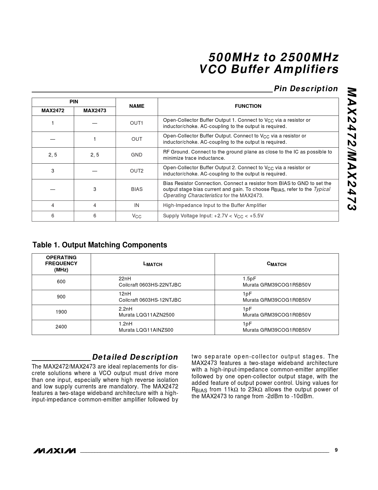 500MHz to 2500MHz. VCO Buffer Amplifiers. MAX2472/MAX2473. Pin Description. PIN. NAME. FUNCTION. MAX2472. MAX2473