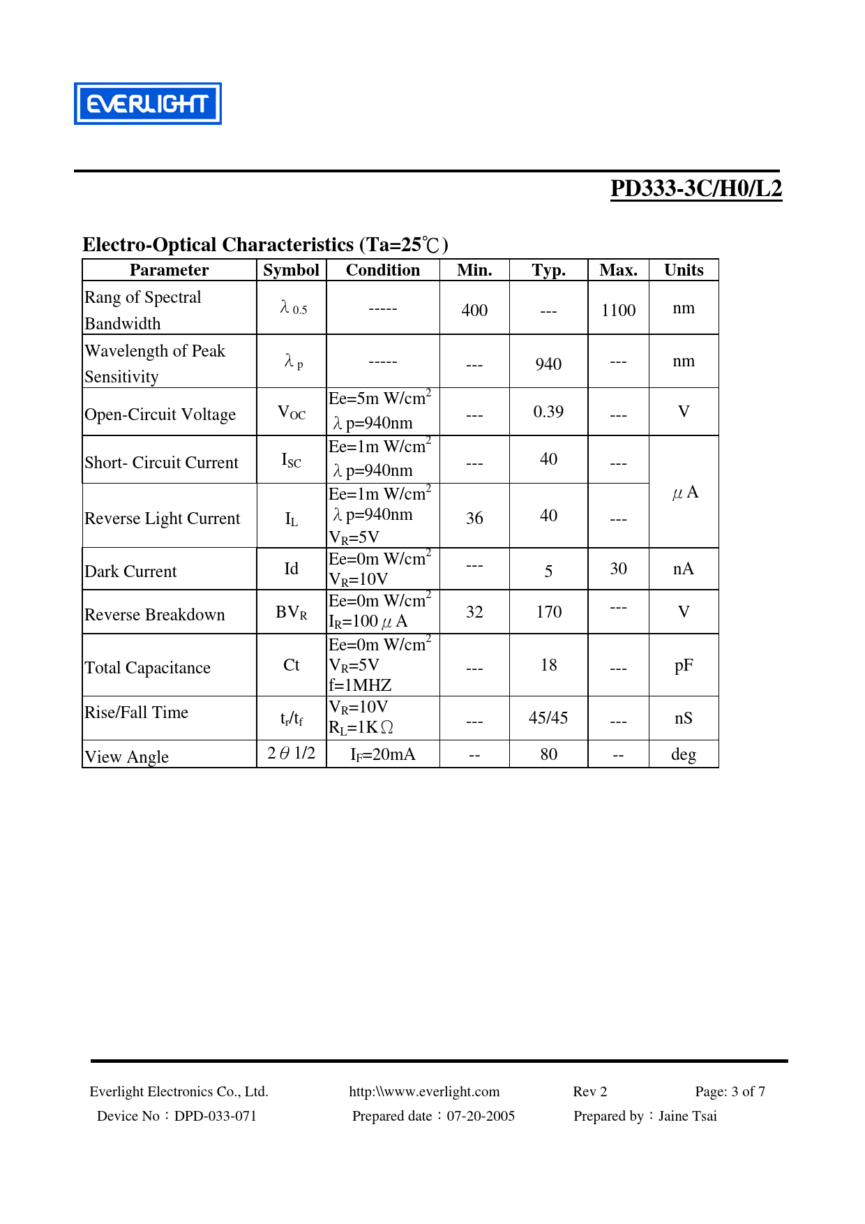| Pages / Page | 7 / 3 — PD333-3C/H0/L2. Electro-Optical Characteristics (Ta=25. Parameter Symbol. … |