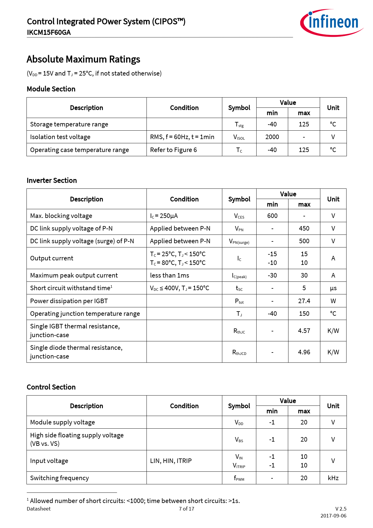 Control Integrated POwer System (CIPOS™) IKCM15F60GA Absolute Maximum Ratings (VDD = 15V and TJ = 25°C, if not stated otherwise) Module Section Value Description Condition Symbol Unit min max Storage temperature range Tstg -40 125 °C Isolation test voltage RMS, f = 60Hz, t = 1min VISOL 2000 - V Operating case temperature range Refer to Figure 6 TC -40 125 °C Inverter Section Value Description Condition Symbol Unit min max Max. blocking voltage IC = 250µA VCES 600 - V DC link supply voltage of P-N Applied between P-N VPN - 450 V DC link supply voltage (surge) of P-N Applied between P-N VPN(surge) - 500 V T -15 15 Output current C = 25°C, TJ < 150°C I A T C C = 80°C, TJ < 150°C -10 10 Maximum peak output current less than 1ms IC(peak) -30 30 A Short circuit withstand time1 VDC ≤ 400V, TJ = 150°C tSC - 5 µs Power dissipation per IGBT Ptot - 27.4 W Operating junction temperature range TJ -40 150 °C Single IGBT thermal resistance, R junction-case thJC - 4.57 K/W Single diode thermal resistance, R junction-case thJCD - 4.96 K/W Control Section Value Description Condition Symbol Unit min max Module supply voltage VDD -1 20 V High side floating supply voltage V (VB vs. VS) BS -1 20 V V -1 10 Input voltage LIN, HIN, ITRIP IN V VITRIP -1 10 Switching frequency fPWM - 20 kHz 1 Allowed number of short circuits: <1000; time between short circuits: >1s. Datasheet 7 of 17 V 2.5 2017-09-06 Document Outline Table of contents CIPOS™ Control Integrated POwer System Features Target Applications Description System Configuration Pin Configuration Internal Electrical Schematic Pin Assignment Pin Description HIN(U, V, W) and LIN(U, V, W) (Low side and high side control pins, Pin 7 - 12) VFO (Fault-output and NTC, Pin 14) ITRIP (Over current detection function, Pin 15) VDD, VSS (Low side control supply and reference, Pin 13, 16) VB(U, V, W) and VS(U, V, W) (High side supplies, Pin 1 - 6) NW, NV, NU (Low side emitter, Pin 17 - 19) W, V, U (High side emitter and low side collector, Pin 20 - 22) P (Positive bus input voltage, Pin 23) Absolute Maximum Ratings Module Section Inverter Section Control Section Recommended Operation Conditions Static Parameters Dynamic Parameters Bootstrap Parameters Thermistor Mechanical Characteristics and Ratings Circuit of a Typical Application Switching Times Definition Electrical characteristic Package Outline Revision history