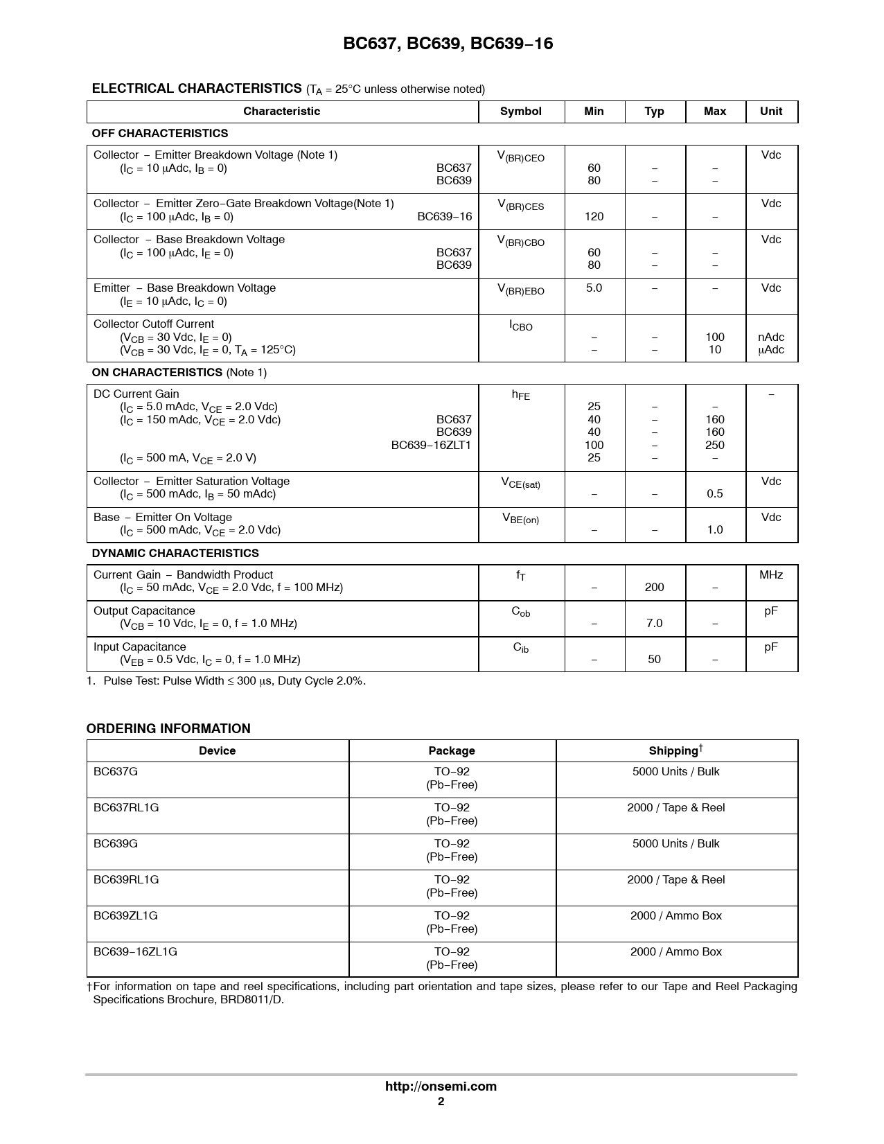 BC637, BC639, BC639−16. ELECTRICAL CHARACTERISTICS. Characteristic. Symbol. Min. Typ. Max. Unit. OFF CHARACTERISTICS. ON CHARACTERISTICS