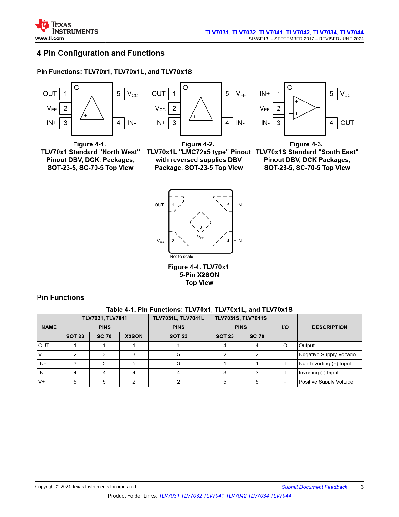 TLV7031, TL. V7032, TL. V7041,. TLV7042,. TLV7034, TL. V7044. www.ti.com. 4 Pin Configuration and Functions