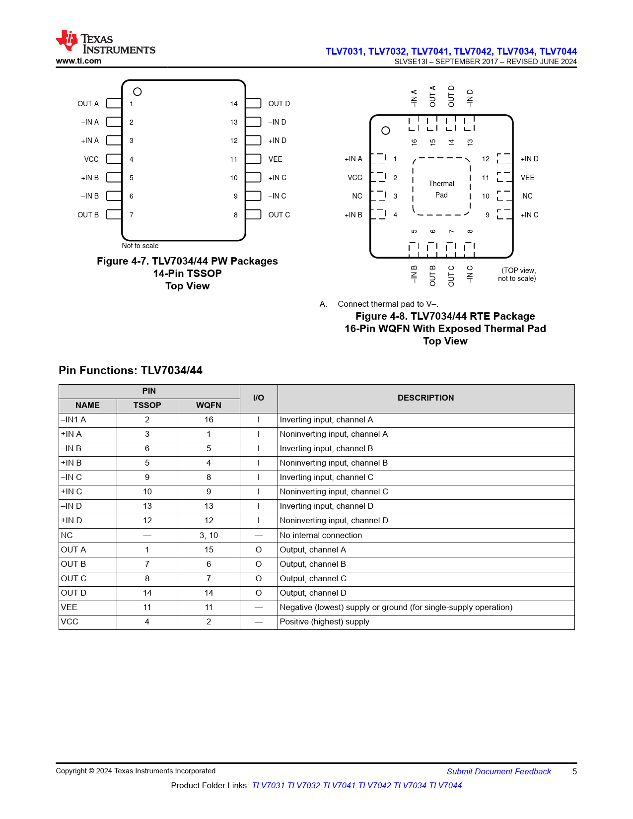 Figure 4-8. TLV7034/44 RTE Package 16-Pin WQFN With Exposed Thermal Pad Top View Pin Functions: TLV7034/44 PIN I/O DESCRIPTION NAME TSSOP WQFN
