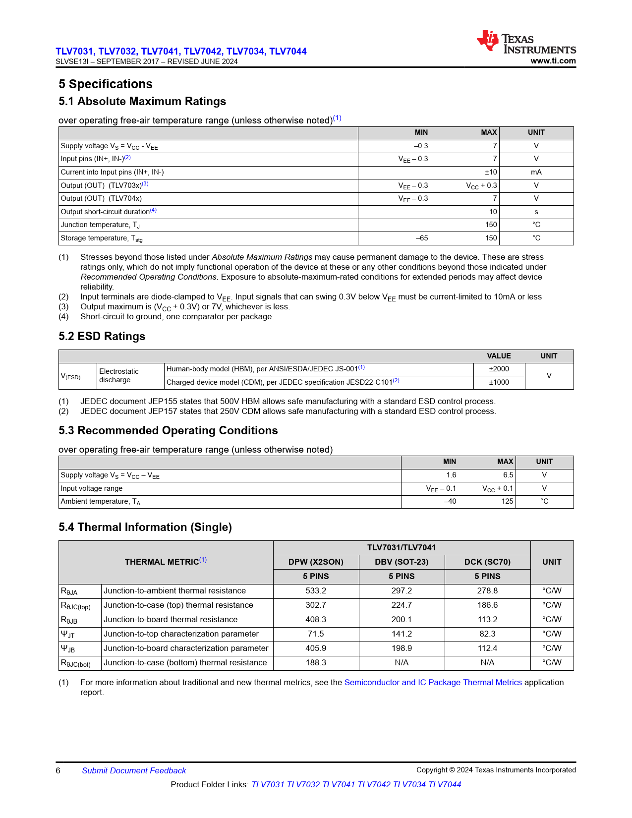 TLV7031, TL. V7032,. TLV7041,. TLV7042, TL. V7034, TL. V7044. www.ti.com. 5 Specifications 5.1 Absolute Maximum Ratings. MIN. MAX. UNIT