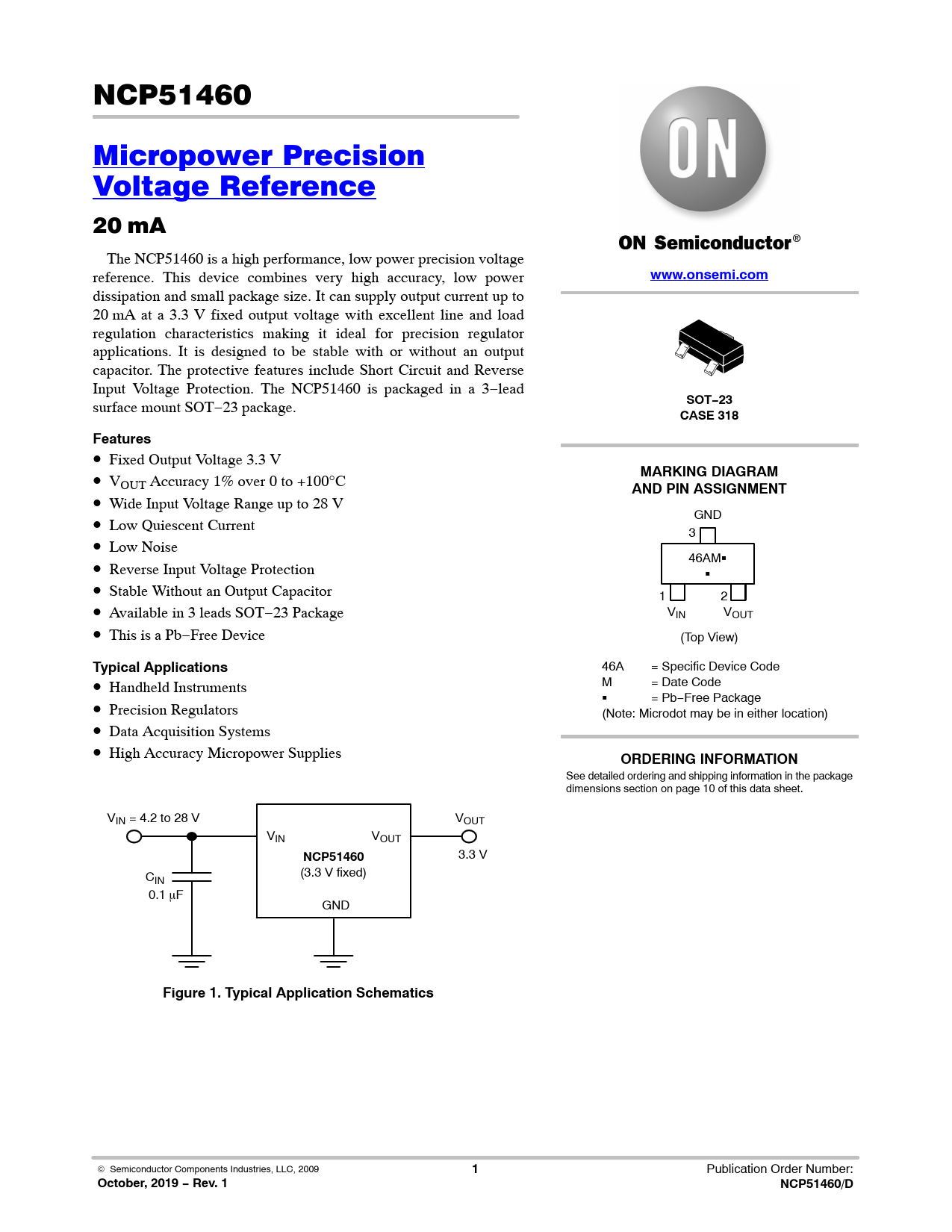 dissipation and small package size. It can supply output current up to 20 mA at a 3.3 V fixed output voltage with excellent line and load regulation characteristics making it ideal for precision regulator applications. It is designed to be stable with or without an output capacitor. The protective features include Short Circuit and Reverse Input Voltage Protection. The NCP51460 is packaged in a 3−lead surface mount SOT−23 package.