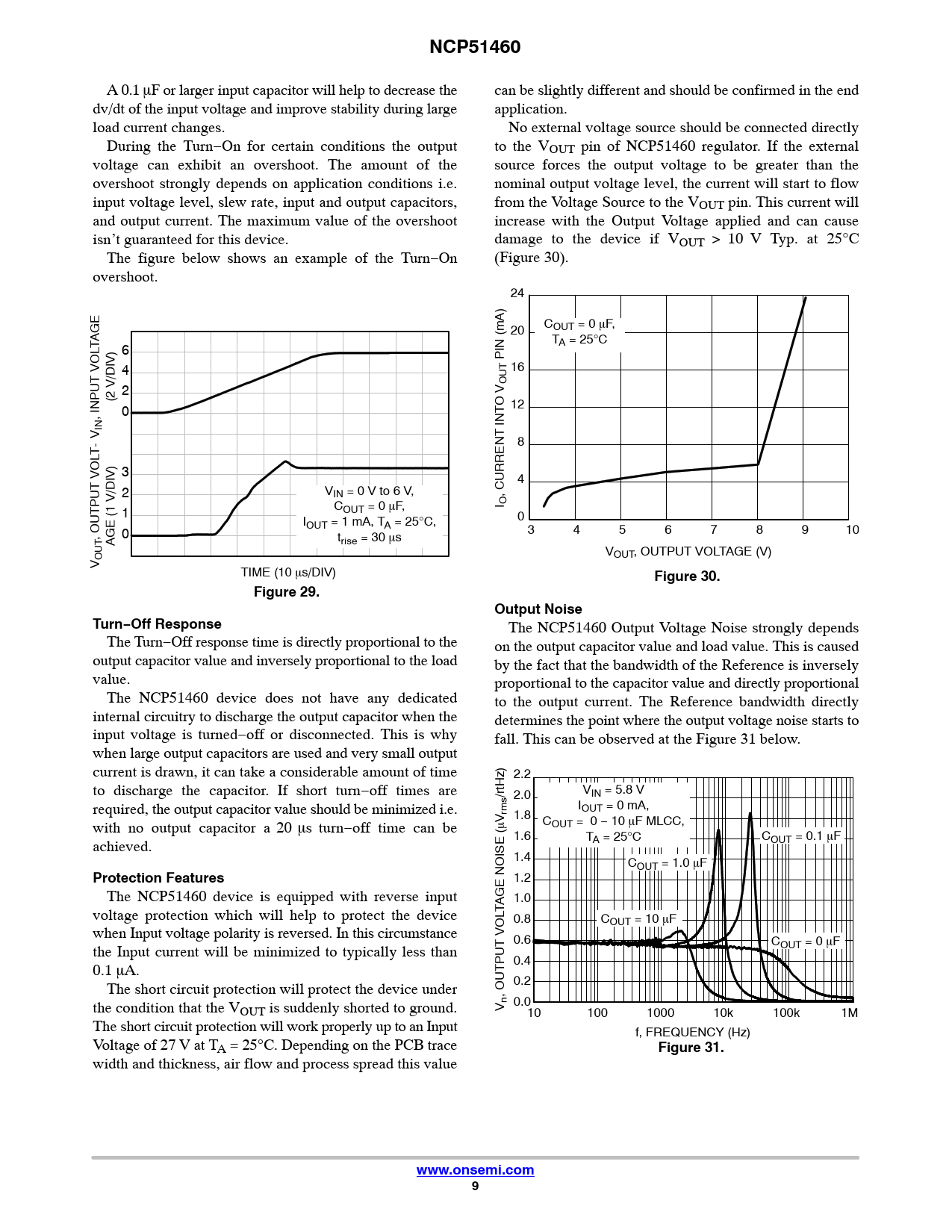 link to page 10 link to page 10 NCP51460 A 0.1 mF or larger input capacitor will help to decrease the can be slightly different and should be confirmed in the end dv/dt of the input voltage and improve stability during large application. load current changes. No external voltage source should be connected directly During the Turn−On for certain conditions the output to the VOUT pin of NCP51460 regulator. If the external voltage can exhibit an overshoot. The amount of the source forces the output voltage to be greater than the overshoot strongly depends on application conditions i.e. nominal output voltage level, the current will start to flow input voltage level, slew rate, input and output capacitors, from the Voltage Source to the VOUT pin. This current will and output current. The maximum value of the overshoot increase with the Output Voltage applied and can cause isn’t guaranteed for this device. damage to the device if VOUT > 10 V Typ. at 25°C The figure below shows an example of the Turn−On (Figure 30). overshoot. 24 20 COUT = 0 mF, TAGE T 6 A = 25°C PIN (mA) 4 16 OUT 2 (2 V/DIV) O V 0 12 , INPUT VOL V IN - 8 T 3 4 2 VIN = 0 V to 6 V, CURRENT INT I O 1 COUT = 0 mF, I 0 OUT = 1 mA, TA = 25°C, OUTPUT VOL 0 3 4 5 6 7 8 9 10 AGE (1 V/DIV) trise = 30 ms VOUT, OUTPUT VOLTAGE (V) V OUT TIME (10 ms/DIV) Figure 30.Figure 29.Output NoiseTurn−Off Response The NCP51460 Output Voltage Noise strongly depends The Turn−Off response time is directly proportional to the on the output capacitor value and load value. This is caused output capacitor value and inversely proportional to the load by the fact that the bandwidth of the Reference is inversely value. proportional to the capacitor value and directly proportional The NCP51460 device does not have any dedicated to the output current. The Reference bandwidth directly internal circuitry to discharge the output capacitor when the determines the point where the output voltage noise starts to input voltage is turned−off or disconnected. This is why fall. This can be observed at the Figure 31 below. when large output capacitors are used and very small output current is drawn, it can take a considerable amount of time 2.2 to discharge the capacitor. If short turn−off times are /rtHz) 2.0 V s IN = 5.8 V required, the output capacitor value should be minimized i.e. I 1.8 OUT = 0 mA, with no output capacitor a 20 ms turn−off time can be mV rm COUT = 0 − 10 mF MLCC, 1.6 TA = 25°C C achieved. OUT = 0.1 mF 1.4 COUT = 1.0 mF Protection Features 1.2 The NCP51460 device is equipped with reverse input 1.0 voltage protection which will help to protect the device TAGE NOISE ( 0.8 COUT = 10 mF when Input voltage polarity is reversed. In this circumstance 0.6 C the Input current will be minimized to typically less than OUT = 0 mF 0.4 0.1 mA. The short circuit protection will protect the device under 0.2 , OUTPUT VOL the condition that the V 0.0 OUT is suddenly shorted to ground. V n 10 100 1000 10k 100k 1M The short circuit protection will work properly up to an Input f, FREQUENCY (Hz) Voltage of 27 V at TA = 25°C. Depending on the PCB trace Figure 31. width and thickness, air flow and process spread this value www.onsemi.com9