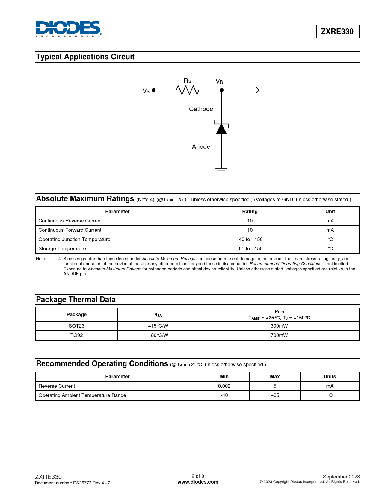 Reverse Current 0.002 5 mA Operating Ambient Temperature Range -40 +85 °C ZXRE330 2 of 9 September 2023 Document number: DS36772 Rev 4 - 2