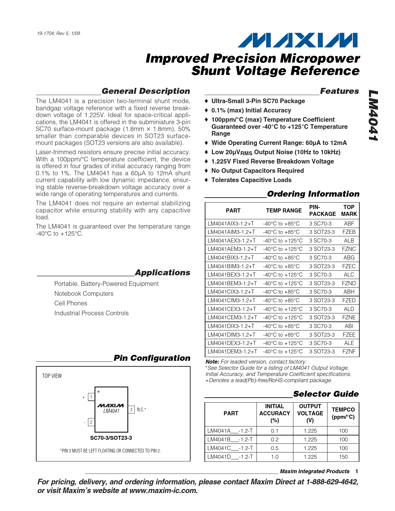 19-1704; Rev 5; 1/09 Improved Precision MicropowerShunt Voltage ReferenceLM4041General DescriptionFeatures The LM4041 is a precision two-terminal shunt mode, ♦ Ultra-Small 3-Pin SC70 Package bandgap voltage reference with a fixed reverse break- ♦ 0.1% (max) Initial Accuracy down voltage of 1.225V. Ideal for space-critical appli- cations, the LM4041 is offered in the subminiature 3-pin ♦ 100ppm/°C (max) Temperature Coefficient SC70 surface-mount package (1.8mm ✕ 1.8mm), 50% Guaranteed over -40°C to +125°C Temperature smaller than comparable devices in SOT23 surface- Range mount packages (SOT23 versions are also available). ♦ Wide Operating Current Range: 60µA to 12mA Laser-trimmed resistors ensure precise initial accuracy. ♦ Low 20µVRMS Output Noise (10Hz to 10kHz) With a 100ppm/°C temperature coefficient, the device ♦ 1.225V Fixed Reverse Breakdown Voltage is offered in four grades of initial accuracy ranging from 0.1% to 1%. The LM4041 has a 60µA to 12mA shunt ♦ No Output Capacitors Required current capability with low dynamic impedance, ensur- ♦ Tolerates Capacitive Loads ing stable reverse-breakdown voltage accuracy over a wide range of operating temperatures and currents. Ordering Information The LM4041 does not require an external stabilizing PIN-TOP capacitor while ensuring stability with any capacitive PARTTEMP RANGEPACKAGEMARK load. LM4041AIX3-1.2+T -40°C to +85°C 3 SC70-3 ABF The LM4041 is guaranteed over the temperature range -40°C to +125°C. LM4041AIM3-1.2+T -40°C to +85°C 3 SOT23-3 FZEB LM4041AEX3-1.2+T -40°C to +125°C 3 SC70-3 ALB LM4041AEM3-1.2+T -40°C to +125°C 3 SOT23-3 FZNC LM4041BIX3-1.2+T -40°C to +85°C 3 SC70-3 ABG LM4041BIM3-1.2+T -40°C to +85°C 3 SOT23-3 FZEC ________________________Applications LM4041BEX3-1.2+T -40°C to +125°C 3 SC70-3 ALC Portable, Battery-Powered Equipment LM4041BEM3-1.2+T -40°C to +125°C 3 SOT23-3 FZND Notebook Computers LM4041CIX3-1.2+T -40°C to +85°C 3 SC70-3 ABH LM4041CIM3-1.2+T -40°C to +85°C 3 SOT23-3 FZED Cell Phones LM4041CEX3-1.2+T -40°C to +125°C 3 SC70-3 ALD Industrial Process Controls LM4041CEM3-1.2+T -40°C to +125°C 3 SOT23-3 FZNE LM4041DIX3-1.2+T -40°C to +85°C 3 SC70-3 ABI LM4041DIM3-1.2+T -40°C to +85°C 3 SOT23-3 FZEE LM4041DEX3-1.2+T -40°C to +125°C 3 SC70-3 ALE LM4041DEM3-1.2+T -40°C to +125°C 3 SOT23-3 FZNF Pin ConfigurationNote: For leaded version, contact factory. *See Selector Guide for a listing of LM4041 Output Voltage, TOP VIEW Initial Accuracy, and Temperature Coefficient specifications. +Denotes a lead(Pb)-free/RoHS-compliant package. Selector Guide + 1 INITIALOUTPUT 3 N.C.* LM4041 TEMPCOPARTACCURACYVOLTAGE(ppm/°C) - 2 (%)(V) LM4041A___-1.2-T 0.1 1.225 100 SC70-3/SOT23-3 LM4041B___-1.2-T 0.2 1.225 100 LM4041C___-1.2-T 0.5 1.225 100 *PIN 3 MUST BE LEFT FLOATING OR CONNECTED TO PIN 2. LM4041D___-1.2-T 1.0 1.225 150 ________________________________________________________________ Maxim Integrated Products1For pricing, delivery, and ordering information, please contact Maxim Direct at 1-888-629-4642, or visit Maxim’s website at www.maxim-ic.com.