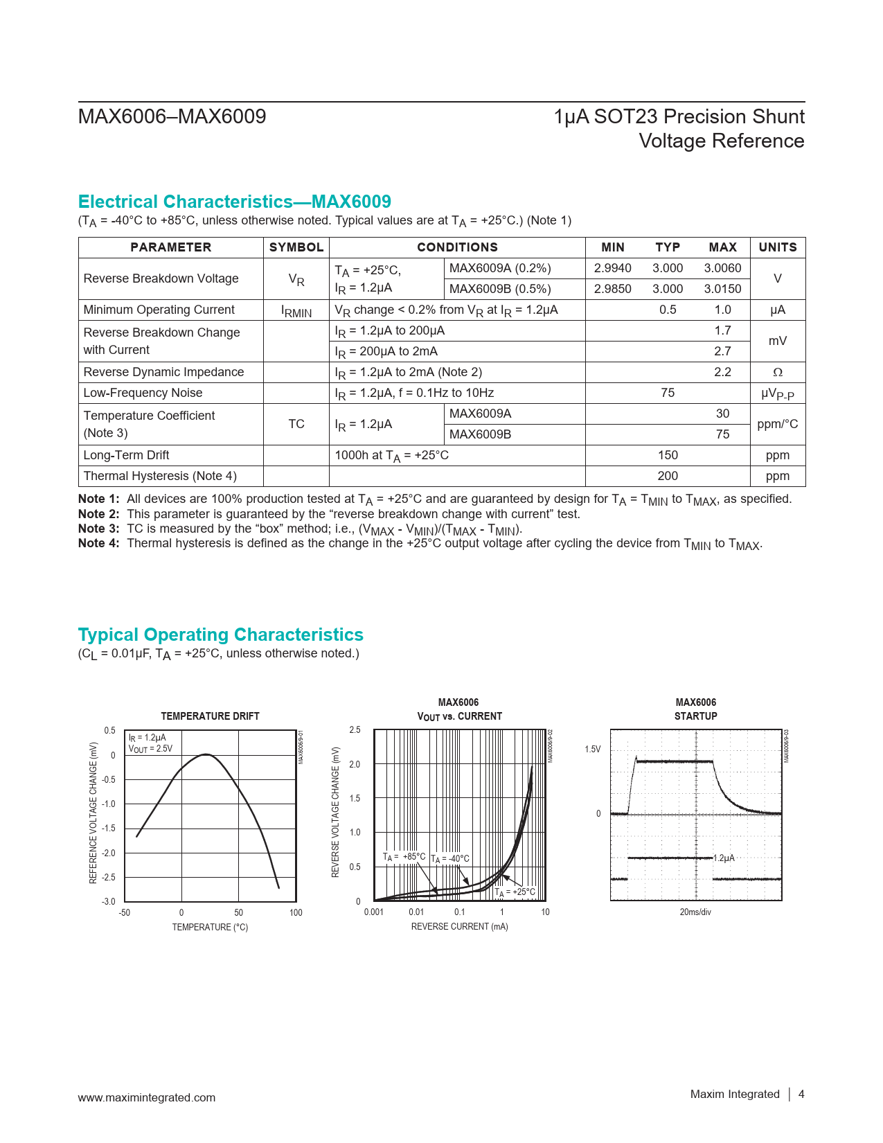 T MAX6009A (0.2%) 2.9940 3.000 3.0060 Reverse Breakdown Voltage V A = +25°C, R V IR = 1.2µA MAX6009B (0.5%) 2.9850 3.000 3.0150 Minimum Operating Current IRMIN VR change < 0.2% from VR at IR = 1.2µA 0.5 1.0 µA Reverse Breakdown Change IR = 1.2µA to 200µA 1.7 mV with Current IR = 200µA to 2mA 2.7 Reverse Dynamic Impedance IR = 1.2µA to 2mA (Note 2) 2.2 W Low-Frequency Noise IR = 1.2µA, f = 0.1Hz to 10Hz 75 µVP-P Temperature Coefficient MAX6009A 30 TC I ppm/°C (Note 3) R = 1.2µA MAX6009B 75 Long-Term Drift 1000h at TA = +25°C 150 ppm Thermal Hysteresis (Note 4) 200 ppm