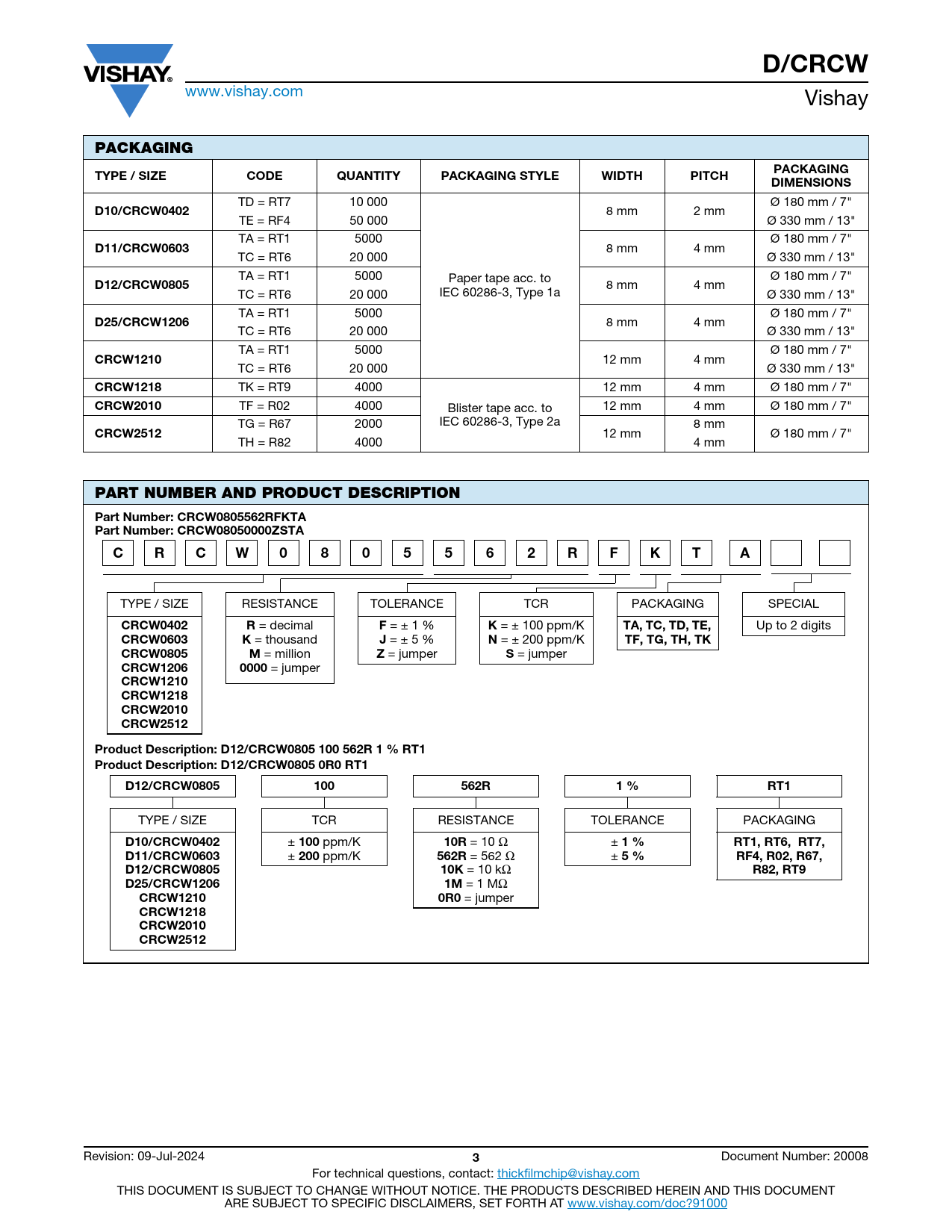 D/CRCW. PACKAGING. TYPE / SIZE. CODE. QUANTITY. PACKAGING STYLE. WIDTH. PITCH. DIMENSIONS. D10/CRCW0402. D11/CRCW0603. D12/CRCW0805