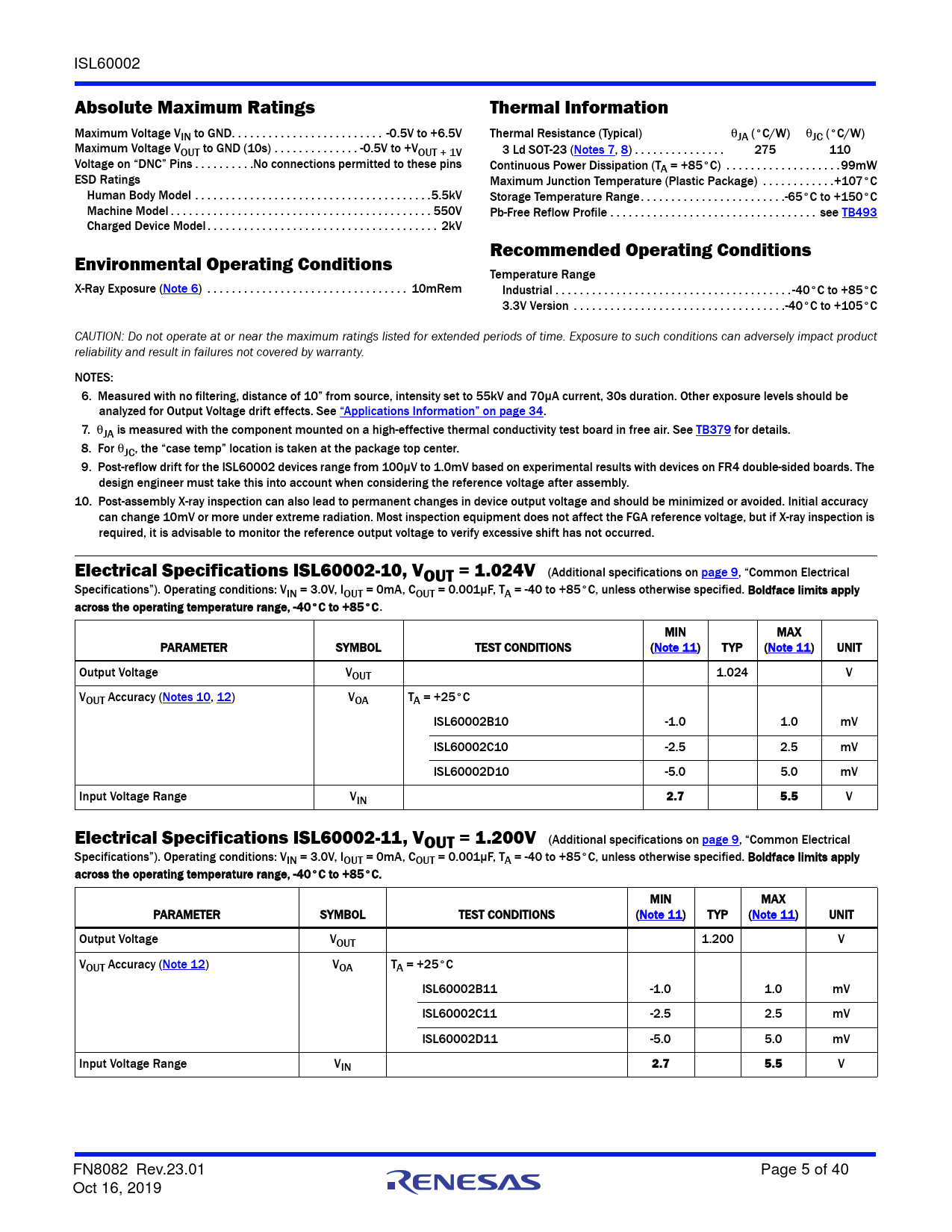 link to page 5 link to page 5 link to page 5 link to page 34 link to page 9 link to page 5 link to page 9 link to page 9 link to page 9 link to page 9 link to page 9 link to page 9 link to page 9 ISL60002 Absolute Maximum Ratings Thermal Information Maximum Voltage VIN to GND. -0.5V to +6.5V Thermal Resistance (Typical) θJA (°C/W) θJC (°C/W) Maximum Voltage VOUT to GND (10s) . -0.5V to +VOUT + 1V 3 Ld SOT-23 (Notes 7, 8) . 275 110 Voltage on “DNC” Pins . .No connections permitted to these pins Continuous Power Dissipation (TA = +85°C) . .99mW ESD Ratings Maximum Junction Temperature (Plastic Package) . .+107°C Human Body Model . .5.5kV Storage Temperature Range. .-65°C to +150°C Machine Model . 550V Pb-Free Reflow Profile . see TB493 Charged Device Model . 2kV Recommended Operating Conditions Environmental Operating Conditions Temperature Range X-Ray Exposure (Note 6) . 10mRem Industrial . -40°C to +85°C 3.3V Version . .-40°C to +105°C CAUTION: Do not operate at or near the maximum ratings listed for extended periods of time. Exposure to such conditions can adversely impact product reliability and result in failures not covered by warranty. NOTES: 6. Measured with no filtering, distance of 10” from source, intensity set to 55kV and 70µA current, 30s duration. Other exposure levels should be analyzed for Output Voltage drift effects. See “Applications Information” on page 34. 7. θJA is measured with the component mounted on a high-effective thermal conductivity test board in free air. See TB379 for details. 8. For θJC, the “case temp” location is taken at the package top center. 9. Post-reflow drift for the ISL60002 devices range from 100µV to 1.0mV based on experimental results with devices on FR4 double-sided boards. The design engineer must take this into account when considering the reference voltage after assembly. 10. Post-assembly X-ray inspection can also lead to permanent changes in device output voltage and should be minimized or avoided. Initial accuracy can change 10mV or more under extreme radiation. Most inspection equipment does not affect the FGA reference voltage, but if X-ray inspection is required, it is advisable to monitor the reference output voltage to verify excessive shift has not occurred. Electrical Specifications ISL60002-10, VOUT = 1.024V (Additional specifications on page 9, “Common Electrical Specifications”). Operating conditions: VIN = 3.0V, IOUT = 0mA, COUT = 0.001µF, TA = -40 to +85°C, unless otherwise specified. Boldface limits apply across the operating temperature range, -40°C to +85°C. MIN MAX PARAMETER SYMBOL TEST CONDITIONS (Note 11) TYP (Note 11) UNIT Output Voltage VOUT 1.024 V VOUT Accuracy (Notes 10, 12) VOA TA = +25°C ISL60002B10 -1.0 1.0 mV ISL60002C10 -2.5 2.5 mV ISL60002D10 -5.0 5.0 mV Input Voltage Range VIN 2.7 5.5 V Electrical Specifications ISL60002-11, VOUT = 1.200V (Additional specifications on page 9, “Common Electrical Specifications”). Operating conditions: VIN = 3.0V, IOUT = 0mA, COUT = 0.001µF, TA = -40 to +85°C, unless otherwise specified. Boldface limits apply across the operating temperature range, -40°C to +85°C. MIN MAX PARAMETER SYMBOL TEST CONDITIONS (Note 11) TYP (Note 11) UNIT Output Voltage VOUT 1.200 V VOUT Accuracy (Note 12) VOA TA = +25°C ISL60002B11 -1.0 1.0 mV ISL60002C11 -2.5 2.5 mV ISL60002D11 -5.0 5.0 mV Input Voltage Range VIN 2.7 5.5 V FN8082 Rev.23.01 Page 5 of 40 Oct 16, 2019 Document Outline Applications Features Related Literature Table of Contents Pin Configuration Pin Descriptions Ordering Information Absolute Maximum Ratings Thermal Information Environmental Operating Conditions Recommended Operating Conditions Electrical Specifications ISL60002-10, VOUT = 1.024V Electrical Specifications ISL60002-11, VOUT = 1.200V Electrical Specifications ISL60002-12, VOUT = 1.250V Electrical Specifications ISL60002-18, VOUT = 1.800V Electrical Specifications ISL60002-20, VOUT = 2.048V Electrical Specifications ISL60002-25, VOUT = 2.500V Electrical Specifications ISL60002-26, VOUT = 2.600V Electrical Specifications ISL60002-30, VOUT = 3.000V Electrical Specifications ISL60002-33, VOUT = 3.300V Common Electrical Specifications ISL60002 -10, -11, -12, -18, -20, and -25 Typical Performance Characteristic Curves, VOUT = 1.024V Typical Performance Characteristic Curves, VOUT = 1.20V Typical Performance Characteristic Curves, VOUT = 1.25V Typical Performance Curves, VOUT = 1.8V Typical Performance Curves, VOUT = 2.048V Typical Performance Characteristic Curves, VOUT = 2.50V Typical Performance Characteristic Curves, VOUT = 3.0V Typical Performance Characteristic Curves, VOUT = 3.3V High Current Application Applications Information FGA Technology Nanopower Operation Board Mounting Considerations Board Assembly Considerations Special Applications Considerations Noise Performance and Reduction Turn-On Time Temperature Coefficient Typical Application Circuits Revision History Package Outline Drawing