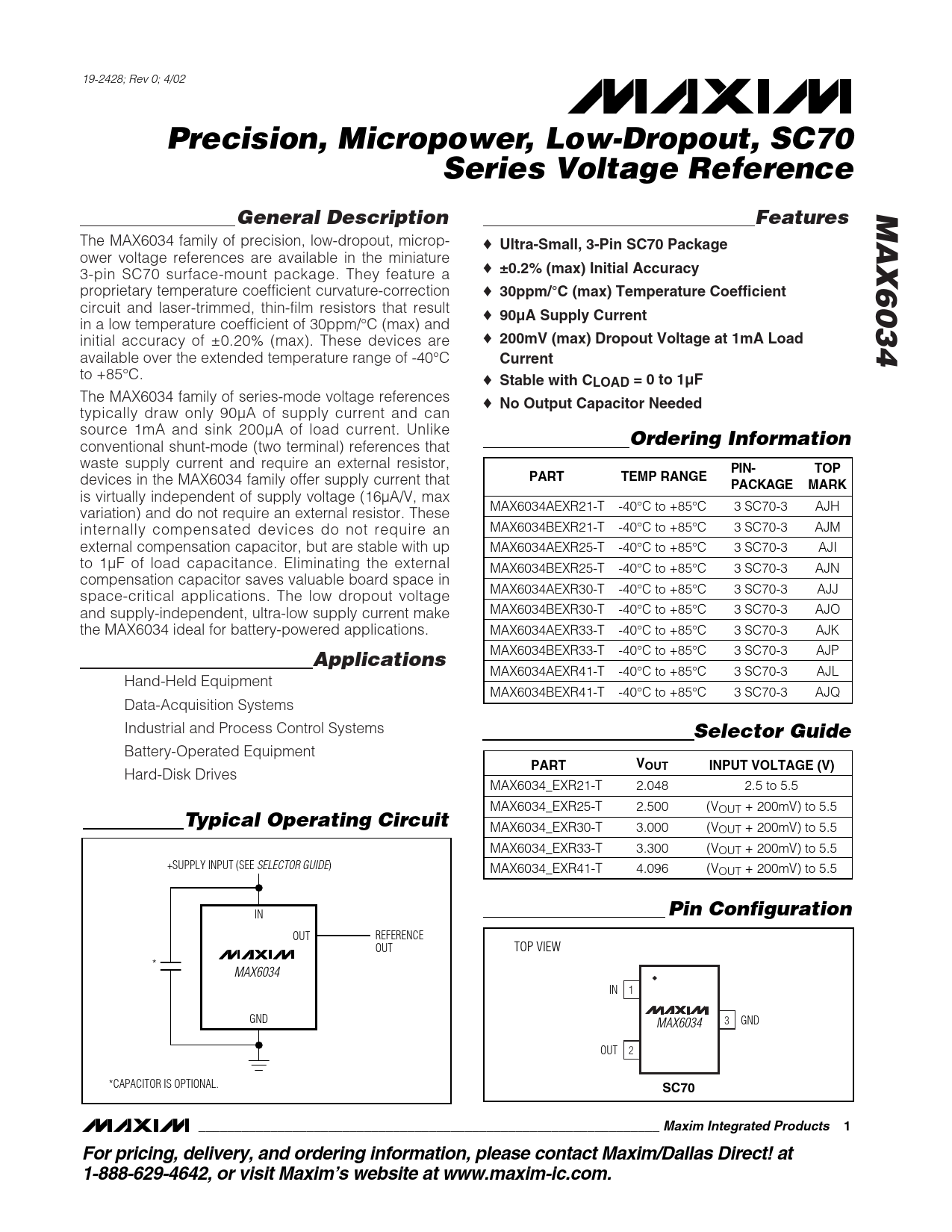 19-2428; Rev 0; 4/02 Precision, Micropower, Low-Dropout, SC70Series Voltage ReferenceMAX6034General DescriptionFeatures The MAX6034 family of precision, low-dropout, microp- ♦ Ultra-Small, 3-Pin SC70 Package ower voltage references are available in the miniature ♦ 3-pin SC70 surface-mount package. They feature a ±0.2% (max) Initial Accuracy proprietary temperature coefficient curvature-correction ♦ 30ppm/°C (max) Temperature Coefficient circuit and laser-trimmed, thin-film resistors that result ♦ 90µA Supply Current in a low temperature coefficient of 30ppm/°C (max) and initial accuracy of ±0.20% (max). These devices are ♦ 200mV (max) Dropout Voltage at 1mA Load available over the extended temperature range of -40°C Current to +85°C. ♦ Stable with CLOAD = 0 to 1µF The MAX6034 family of series-mode voltage references ♦ No Output Capacitor Needed typically draw only 90µA of supply current and can source 1mA and sink 200µA of load current. Unlike Ordering Information conventional shunt-mode (two terminal) references that waste supply current and require an external resistor, PI N -TOP devices in the MAX6034 family offer supply current that PARTTEMP RANGEPA C K A G EMARK is virtually independent of supply voltage (16µA/V, max MAX6034AEXR21-T -40°C to +85°C 3 SC70-3 AJH variation) and do not require an external resistor. These internally compensated devices do not require an MAX6034BEXR21-T -40°C to +85°C 3 SC70-3 AJM external compensation capacitor, but are stable with up MAX6034AEXR25-T -40°C to +85°C 3 SC70-3 AJI to 1µF of load capacitance. Eliminating the external MAX6034BEXR25-T -40°C to +85°C 3 SC70-3 AJN compensation capacitor saves valuable board space in MAX6034AEXR30-T -40°C to +85°C 3 SC70-3 AJJ space-critical applications. The low dropout voltage and supply-independent, ultra-low supply current make MAX6034BEXR30-T -40°C to +85°C 3 SC70-3 AJO the MAX6034 ideal for battery-powered applications. MAX6034AEXR33-T -40°C to +85°C 3 SC70-3 AJK MAX6034BEXR33-T -40°C to +85°C 3 SC70-3 AJP Applications MAX6034AEXR41-T -40°C to +85°C 3 SC70-3 AJL Hand-Held Equipment MAX6034BEXR41-T -40°C to +85°C 3 SC70-3 AJQ Data-Acquisition Systems Industrial and Process Control Systems Selector Guide Battery-Operated Equipment PARTVOUTINPUT VOLTAGE (V) Hard-Disk Drives MAX6034_EXR21-T 2.048 2.5 to 5.5 MAX6034_EXR25-T 2.500 (VOUT + 200mV) to 5.5 Typical Operating Circuit MAX6034_EXR30-T 3.000 (VOUT + 200mV) to 5.5 MAX6034_EXR33-T 3.300 (VOUT + 200mV) to 5.5 +SUPPLY INPUT (SEE SELECTOR GUIDE) MAX6034_EXR41-T 4.096 (VOUT + 200mV) to 5.5 IN Pin Configuration OUT REFERENCE OUT TOP VIEW * MAX6034 IN 1 GND 3 GND MAX6034 OUT 2 *CAPACITOR IS OPTIONAL. SC70________________________________________________________________ Maxim Integrated Products1For pricing, delivery, and ordering information, please contact Maxim/Dallas Direct! at 1-888-629-4642, or visit Maxim’s website at www.maxim-ic.com.