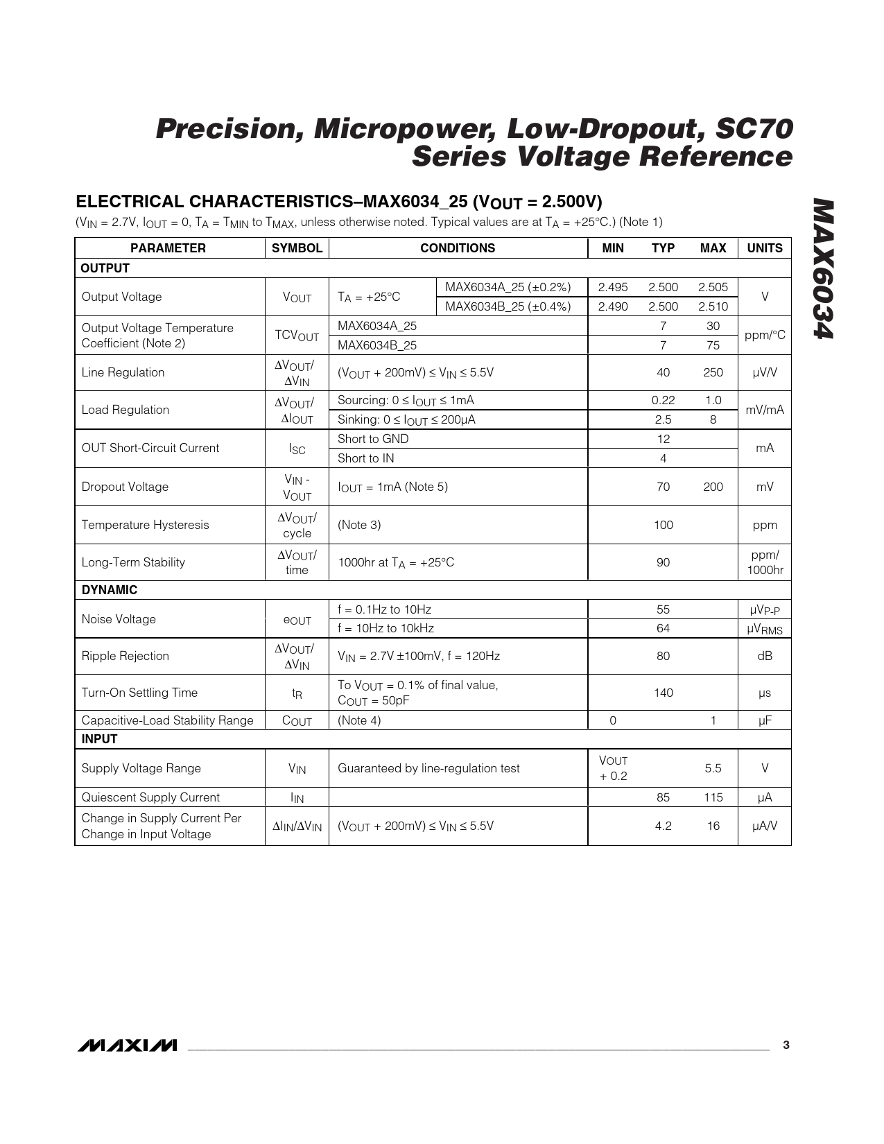 Precision, Micropower, Low-Dropout, SC70Series Voltage ReferenceMAX6034ELECTRICAL CHARACTERISTICS–MAX6034_25 (VOUT = 2.500V) (VIN = 2.7V, IOUT = 0, TA = TMIN to TMAX, unless otherwise noted. Typical values are at TA = +25°C.) (Note 1) PARAMETERSYMBOLCONDITIONSMINTYPMAXUNITSOUTPUT MAX6034A_25 (±0.2%) 2.495 2.500 2.505 Output Voltage VOUT TA = +25°C V MAX6034B_25 (±0.4%) 2.490 2.500 2.510 Output Voltage Temperature MAX6034A_25 7 30 TCVOUT ppm/°C Coefficient (Note 2) MAX6034B_25 7 75 ∆VOUT/ Line Regulation ∆ (VOUT + 200mV) ≤ VIN ≤ 5.5V 40 250 µV/V VIN Sourcing: 0 ∆VOUT/ ≤ IOUT ≤ 1mA 0.22 1.0 Load Regulation ∆ mV/mA IOUT Sinking: 0 ≤ IOUT ≤ 200µA 2.5 8 Short to GND 12 OUT Short-Circuit Current ISC mA Short to IN 4 V Dropout Voltage IN - IOUT = 1mA (Note 5) 70 200 mV VOUT ∆V Temperature Hysteresis OUT/ (Note 3) 100 ppm cycle ∆VOUT/ ppm/ Long-Term Stability 1000hr at T time A = +25°C 90 1000hr DYNAMIC f = 0.1Hz to 10Hz 55 µVP-P Noise Voltage eOUT f = 10Hz to 10kHz 64 µVRMS ∆VOUT/ Ripple Rejection ∆ VIN = 2.7V ±100mV, f = 120Hz 80 dB VIN To VOUT = 0.1% of final value, Turn-On Settling Time tR 140 µs COUT = 50pF Capacitive-Load Stability Range COUT (Note 4) 0 1 µF INPUT VOUT Supply Voltage Range VIN Guaranteed by line-regulation test 5.5 V + 0.2 Quiescent Supply Current IIN 85 115 µA Change in Supply Current Per ∆IIN/∆VIN (VOUT + 200mV) ≤ VIN ≤ 5.5V 4.2 16 µA/V Change in Input Voltage _______________________________________________________________________________________3