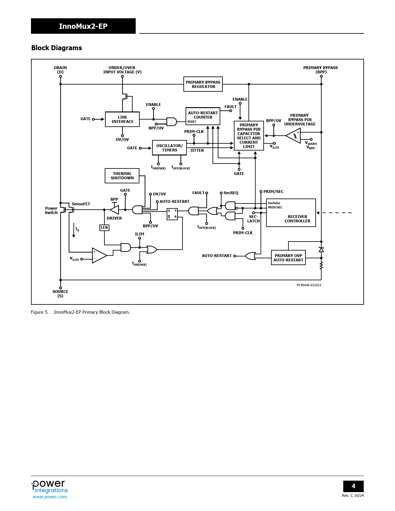 InnoMux2-EP Block Diagrams DRAIN UNDER/OVER PRIMARY BYPASS (D) INPUT VOLTAGE (V) (BPP) PRIMARY BYPASS REGULATOR ENABLE ENABLE FAULT AUTO-RESTART PRIMARY GATE LINE COUNTER BYPASS PIN INTERFACE RESET BPP/UV PRIMARY UNDERVOLTAGE BPP/UV PRIM-CLK BYPASS PIN