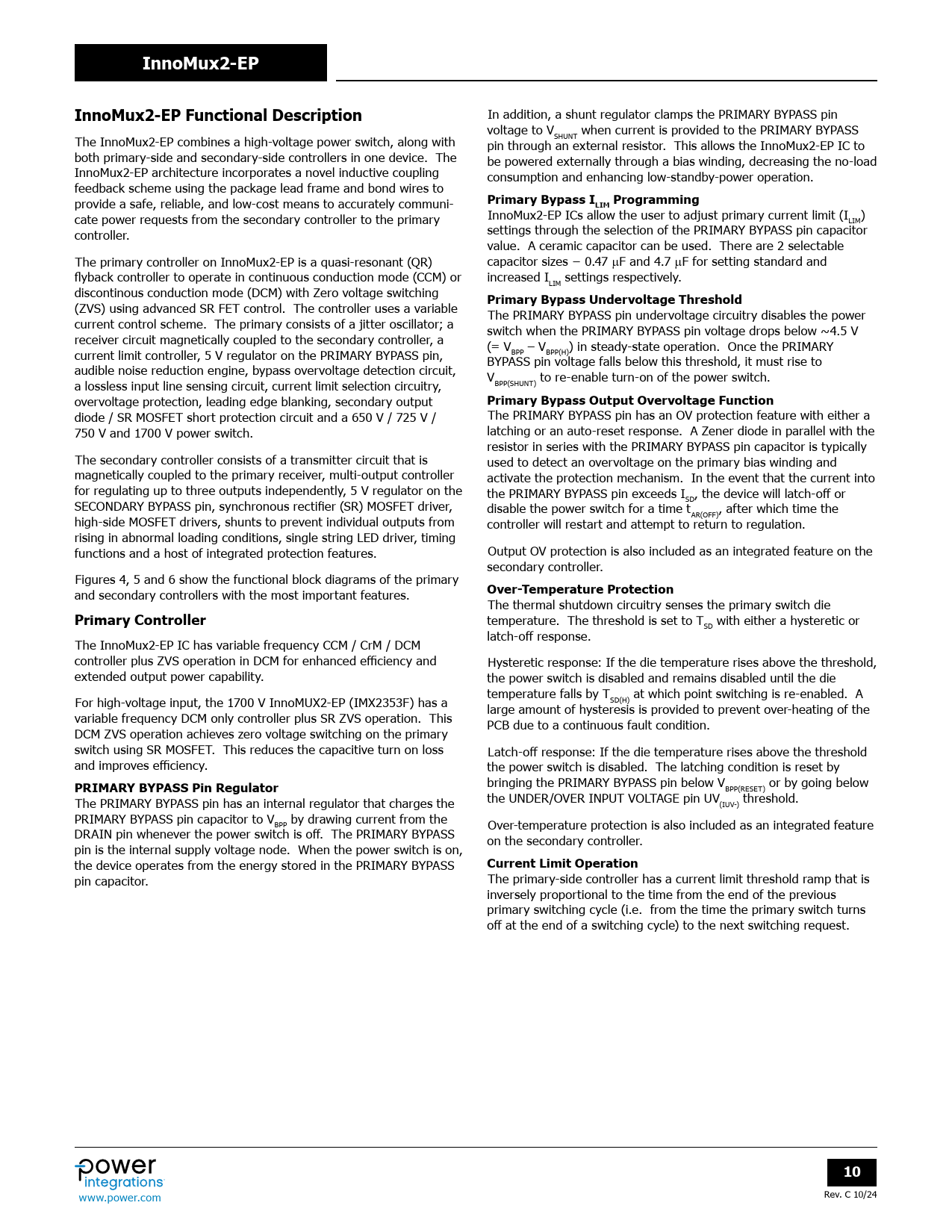 cate power requests from the secondary control er to the primary InnoMux2-EP ICs al ow the user to adjust primary current limit (I ) LIM controller. settings through the selection of the PRIMARY BYPASS pin capacitor value. A ceramic capacitor can be used. There are 2 selectable The primary control er on InnoMux2-EP is a quasi-resonant (QR) capacitor sizes − 0.47 μF and 4.7 μF for setting standard and flyback control er to operate in continuous conduction mode (CCM) or increased I settings respectively. LIM discontinous conduction mode (DCM) with Zero voltage switching
