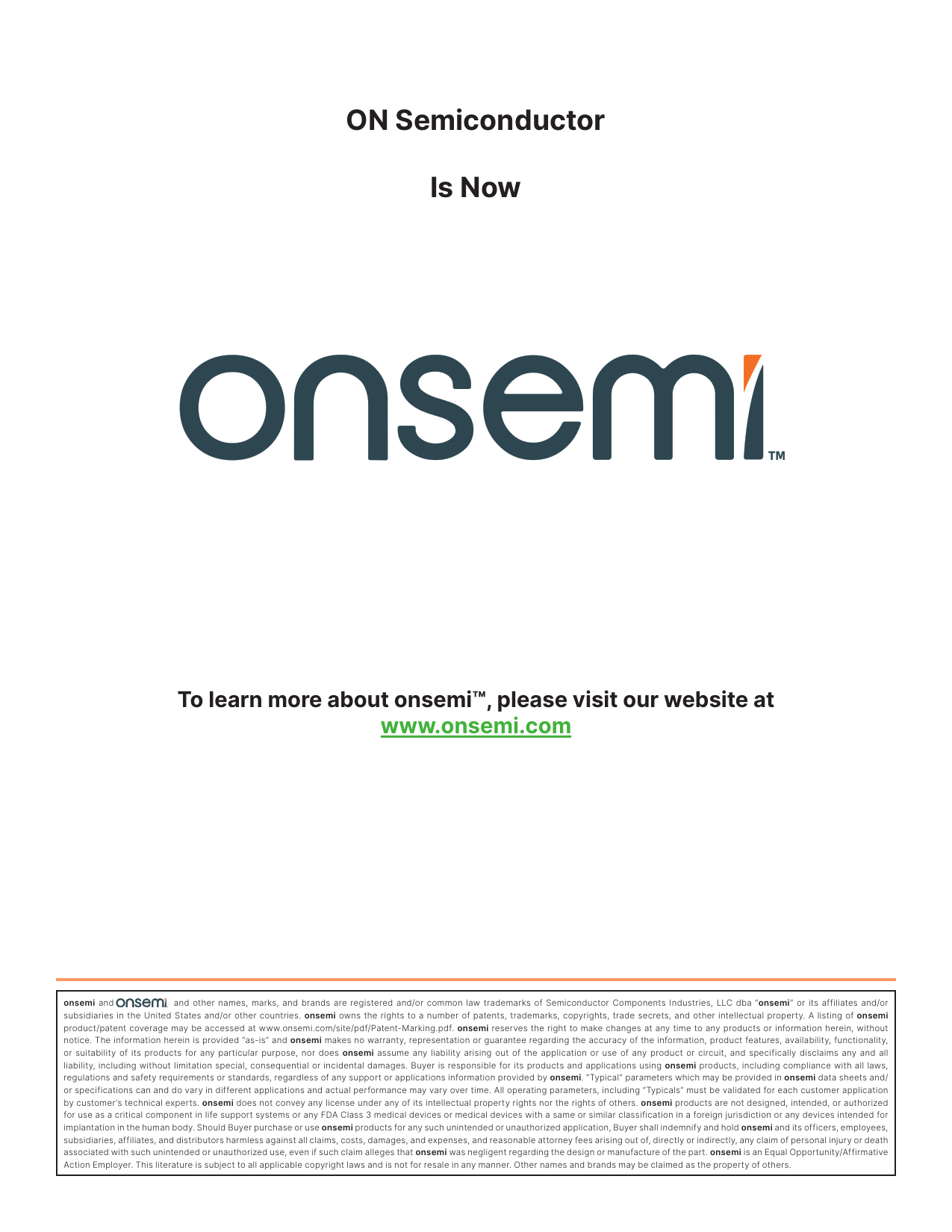 ON Semiconductor. Is Now. To learn more about onsemi™, please visit our website at. www.onsemi.com. onsemi
