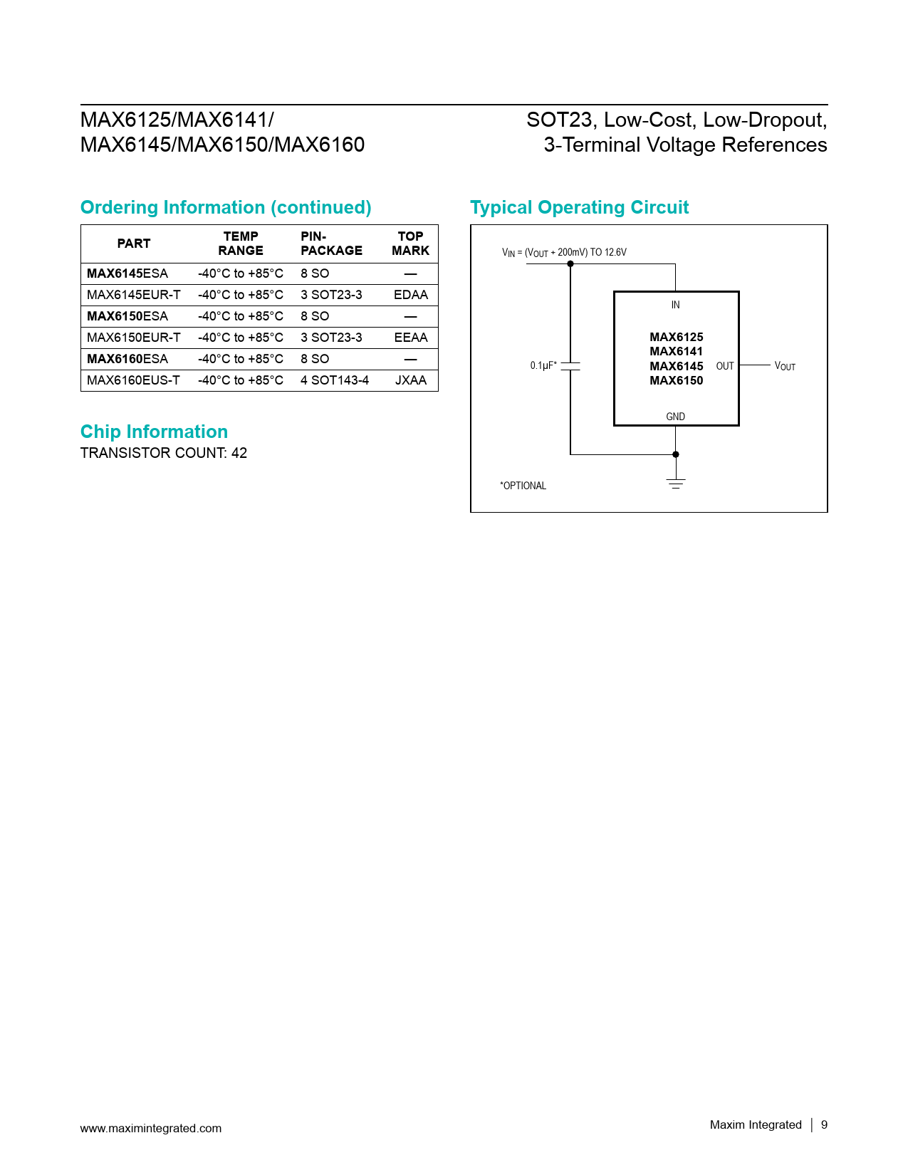 MAX6125/MAX6141/ SOT23, Low-Cost, Low-Dropout, MAX6145/MAX6150/MAX6160 3-Terminal Voltage References Ordering Information (continued)Typical Operating CircuitPARTTEMPPIN-TOPRANGEPACKAGEMARK VIN = (VOUT + 200mV) TO 12.6V MAX6145 ESA -40°C to +85°C 8 SO — MAX6145EUR-T -40°C to +85°C 3 SOT23-3 EDAA IN MAX6150 ESA -40°C to +85°C 8 SO — MAX6150EUR-T -40°C to +85°C 3 SOT23-3 EEAA MAX6125MAX6160 ESA -40°C to +85°C 8 SO — MAX6141 0.1µF* MAX6145 OUT VOUT MAX6160EUS-T -40°C to +85°C 4 SOT143-4 JXAA MAX6150 GND Chip Information TRANSISTOR COUNT: 42 *OPTIONAL www.maximintegrated.com Maxim Integrated │ 9