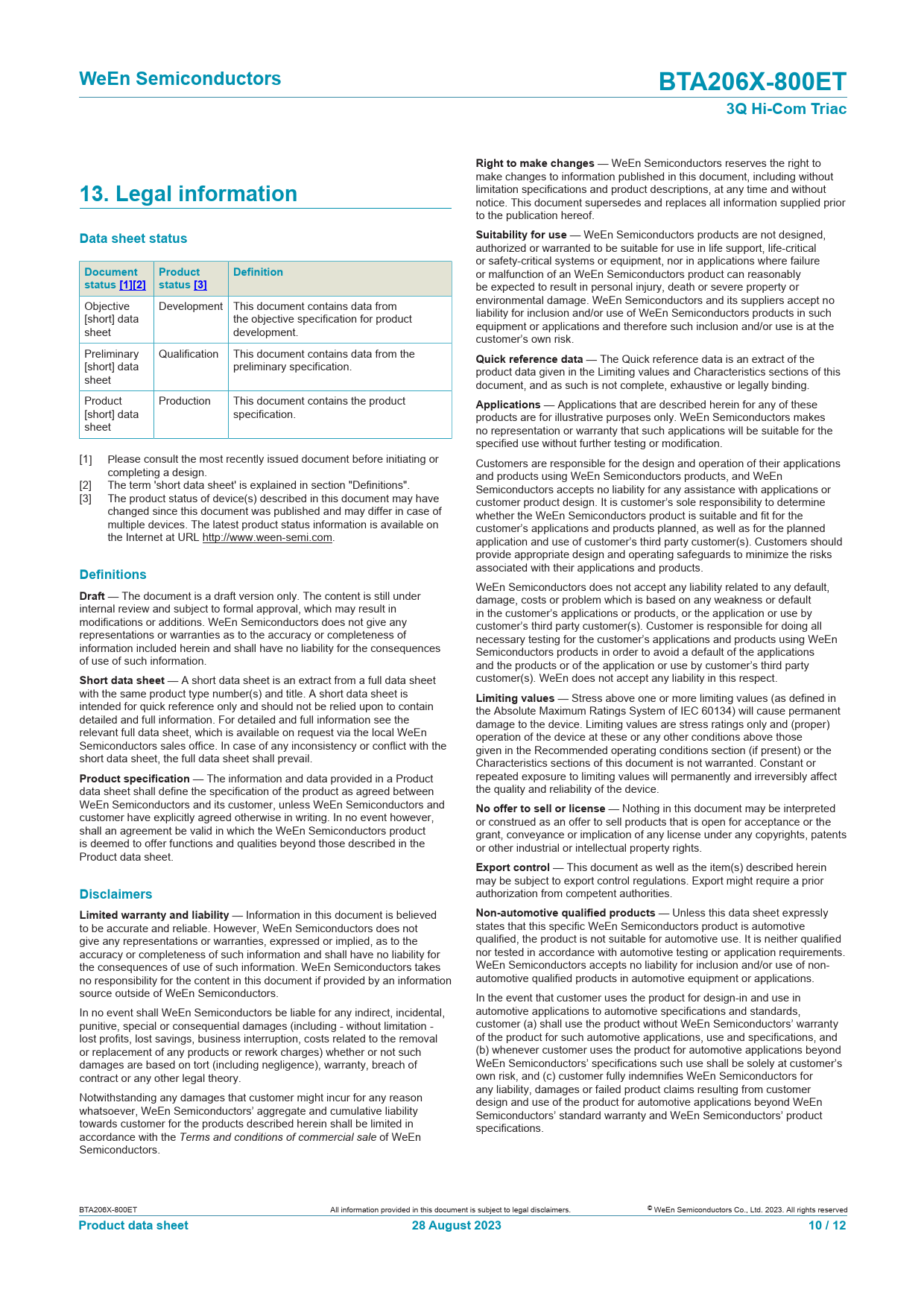WeEn Semiconductors. BTA206X-800ET. 3Q Hi-Com Triac. Right to make changes. 13. Legal information. Data sheet status