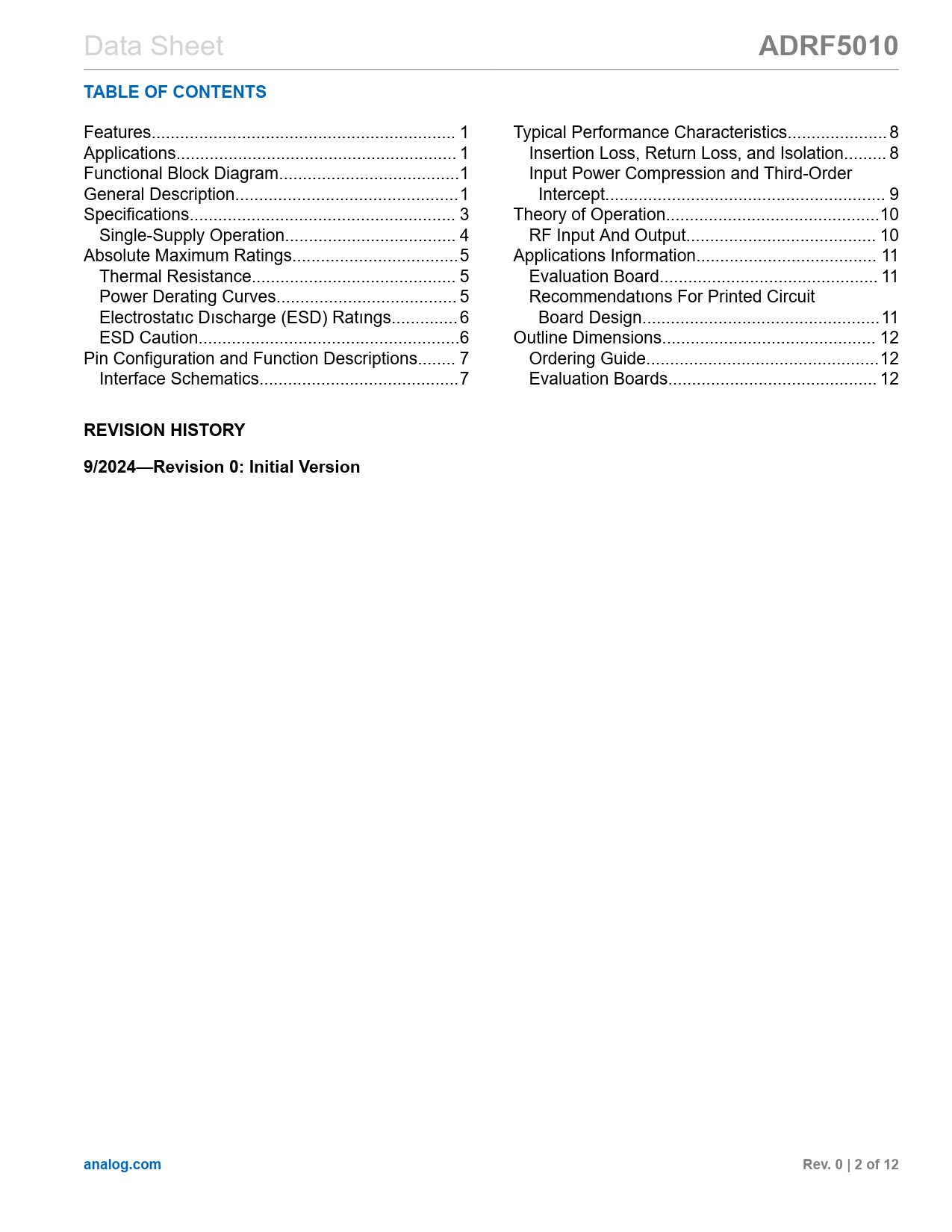 Pages / Page12 / 2 — ADRF5010. TABLE OF CONTENTS. REVISION HISTORY. 9/2024—Revision 0: Initial …