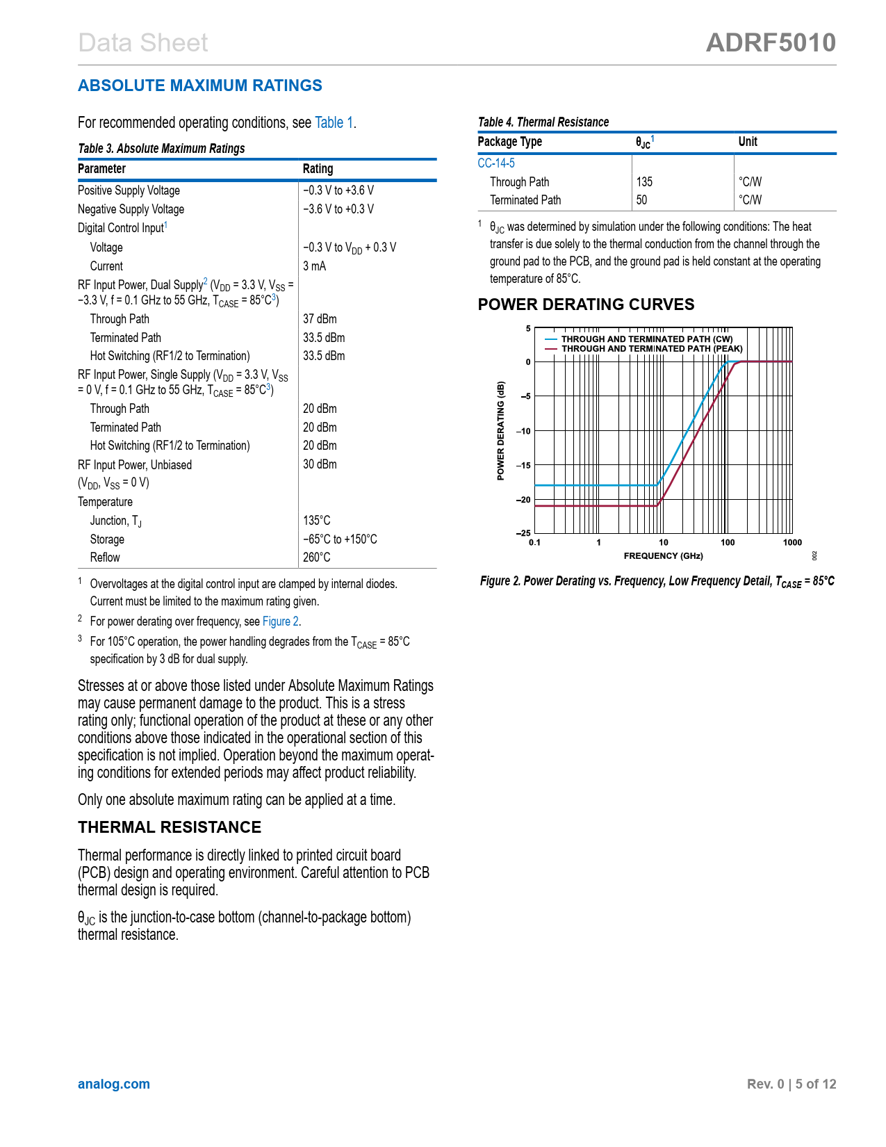 Pages / Page12 / 5 — ADRF5010. ABSOLUTE MAXIMUM RATINGS. Table 4. Thermal Resistance. Table 3. …