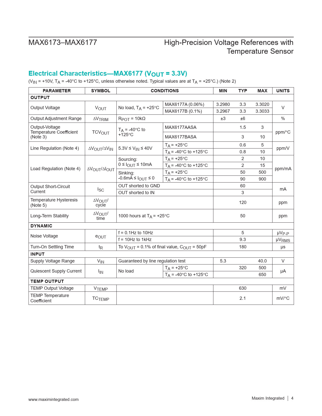 Electrical Characteristics—MAX6177 (VOUT = 3.3V). PARAMETER. SYMBOL. CONDITIONS. MIN. TYP. MAX. UNITS. OUTPUT. DYNAMIC. INPUT. TEMP OUTPUT