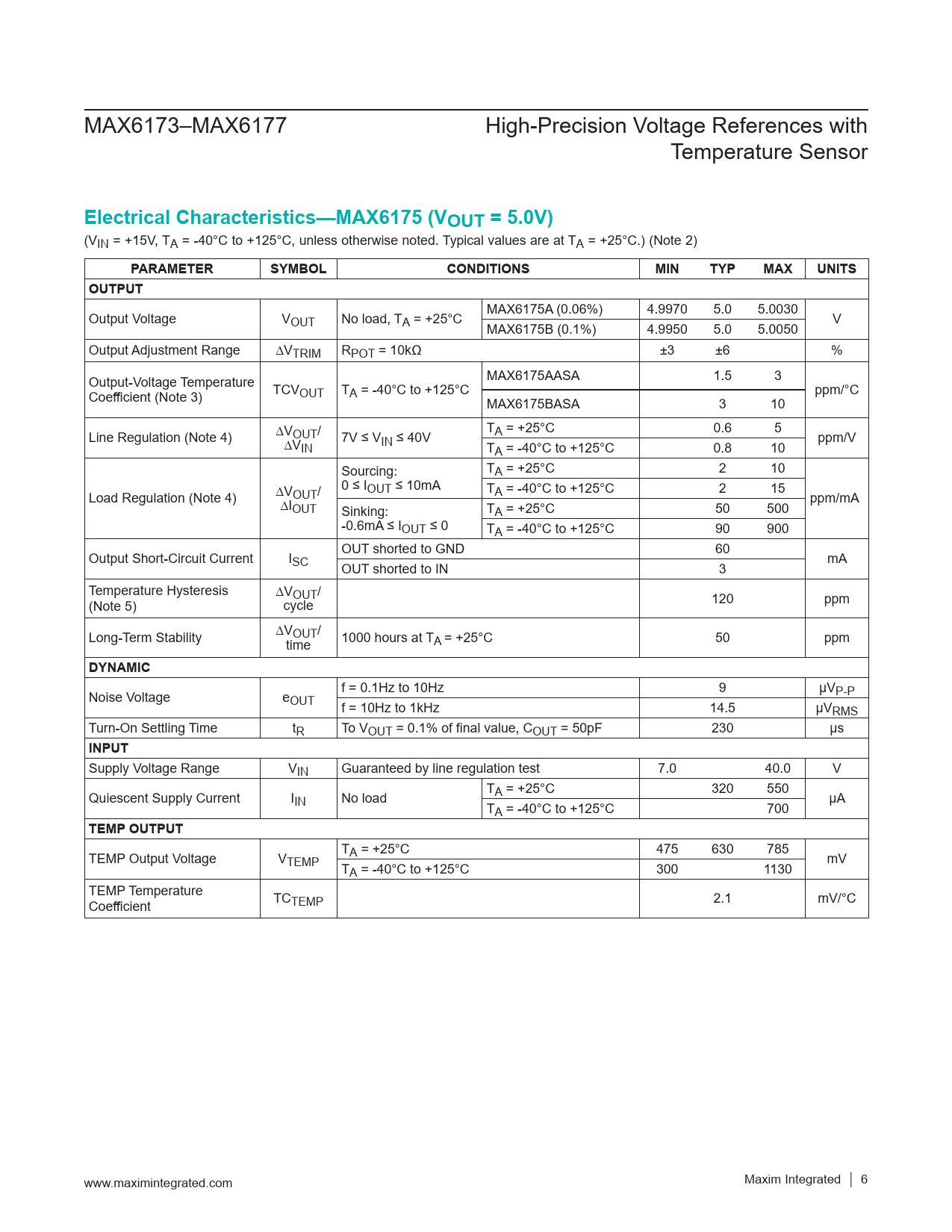 MAX6173–MAX6177 High-Precision Voltage References with Temperature Sensor Electrical Characteristics—MAX6175 (VOUT = 5.0V) (VIN = +15V, TA = -40°C to +125°C, unless otherwise noted. Typical values are at TA = +25°C.) (Note 2) PARAMETERSYMBOLCONDITIONSMINTYPMAXUNITSOUTPUT MAX6175A (0.06%) 4.9970 5.0 5.0030 Output Voltage VOUT No load, TA = +25°C V MAX6175B (0.1%) 4.9950 5.0 5.0050 Output Adjustment Range DVTRIM RPOT = 10kΩ ±3 ±6 % Output-Voltage Temperature MAX6175AASA 1.5 3 Coefficient (Note 3) TCVOUT TA = -40°C to +125°C ppm/°C MAX6175BASA 3 10 T Line Regulation (Note 4) DVOUT/ A = +25°C 0.6 5 DV 7V ≤ V ppm/V IN IN ≤ 40V TA = -40°C to +125°C 0.8 10 Sourcing: TA = +25°C 2 10 0 ≤ IOUT ≤ 10mA T Load Regulation (Note 4) DVOUT/ A = -40°C to +125°C 2 15 DI ppm/mA OUT Sinking: TA = +25°C 50 500 -0.6mA ≤ IOUT ≤ 0 TA = -40°C to +125°C 90 900 OUT shorted to GND 60 Output Short-Circuit Current ISC mA OUT shorted to IN 3 Temperature Hysteresis DVOUT/ (Note 5) cycle 120 ppm Long-Term Stability DVOUT/ time 1000 hours at TA = +25°C 50 ppm DYNAMIC f = 0.1Hz to 10Hz 9 µV Noise Voltage e P-P OUT f = 10Hz to 1kHz 14.5 µVRMS Turn-On Settling Time tR To VOUT = 0.1% of final value, COUT = 50pF 230 µs INPUT Supply Voltage Range VIN Guaranteed by line regulation test 7.0 40.0 V T Quiescent Supply Current I A = +25°C 320 550 IN No load µA TA = -40°C to +125°C 700 TEMP OUTPUT T TEMP Output Voltage V A = +25°C 475 630 785 TEMP mV TA = -40°C to +125°C 300 1130 TEMP Temperature Coefficient TCTEMP 2.1 mV/°C www.maximintegrated.com Maxim Integrated │ 6 Document Outline _GoBack