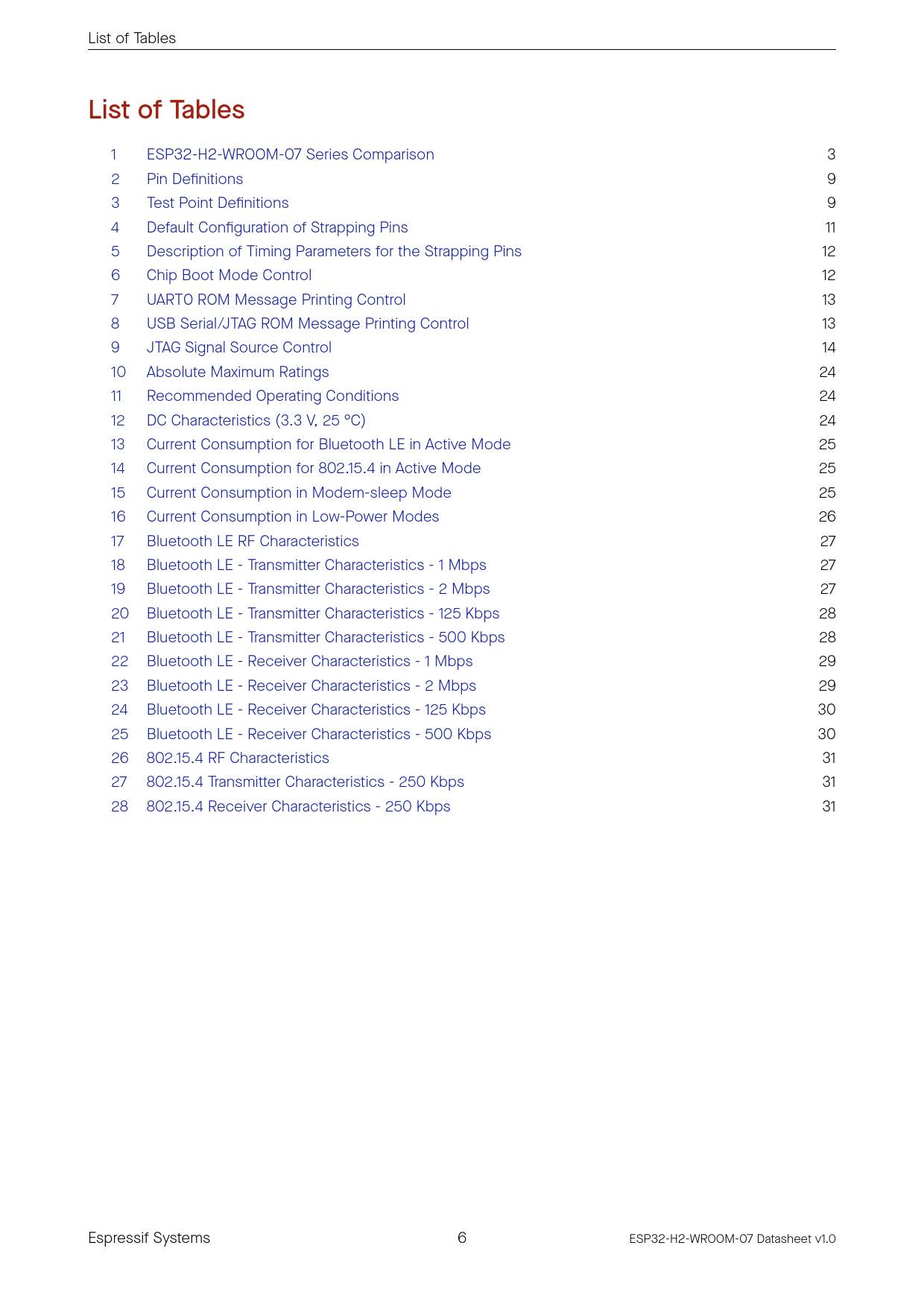link to page 2 link to page 9 link to page 9 link to page 11 link to page 12 link to page 12 link to page 13 link to page 13 link to page 14 link to page 24 link to page 24 link to page 24 link to page 25 link to page 25 link to page 25 link to page 26 link to page 27 link to page 27 link to page 27 link to page 28 link to page 28 link to page 29 link to page 29 link to page 30 link to page 30 link to page 31 link to page 31 link to page 31 List of Tables List of Tables 1 ESP32-H2-WROOM-07 Series Comparison 3 2 Pin Definitions 9 3 Test Point Definitions 9 4 Default Configuration of Strapping Pins 11 5 Description of Timing Parameters for the Strapping Pins 12 6 Chip Boot Mode Control 12 7 UART0 ROM Message Printing Control 13 8 USB Serial/JTAG ROM Message Printing Control 13 9 JTAG Signal Source Control 14 10 Absolute Maximum Ratings 24 11 Recommended Operating Conditions 24 12 DC Characteristics (3.3 V, 25 °C) 24 13 Current Consumption for Bluetooth LE in Active Mode 25 14 Current Consumption for 802.15.4 in Active Mode 25 15 Current Consumption in Modem-sleep Mode 25 16 Current Consumption in Low-Power Modes 26 17 Bluetooth LE RF Characteristics 27 18 Bluetooth LE - Transmitter Characteristics - 1 Mbps 27 19 Bluetooth LE - Transmitter Characteristics - 2 Mbps 27 20 Bluetooth LE - Transmitter Characteristics - 125 Kbps 28 21 Bluetooth LE - Transmitter Characteristics - 500 Kbps 28 22 Bluetooth LE - Receiver Characteristics - 1 Mbps 29 23 Bluetooth LE - Receiver Characteristics - 2 Mbps 29 24 Bluetooth LE - Receiver Characteristics - 125 Kbps 30 25 Bluetooth LE - Receiver Characteristics - 500 Kbps 30 26 802.15.4 RF Characteristics 31 27 802.15.4 Transmitter Characteristics - 250 Kbps 31 28 802.15.4 Receiver Characteristics - 250 Kbps 31 Espressif Systems 6 ESP32-H2-WROOM-07 Datasheet v1.0 Document Outline 1 Module Overview 1.1 Features 1.2 Series Comparison 1.3 Applications 2 Block Diagram 3 Pin Definitions 3.1 Pin Layout 3.2 Pin Description 4 Boot Configurations 4.1 Chip Boot Mode Control 4.2 ROM Messages Printing Control 4.3 JTAG Signal Source Control 5 Peripherals 5.1 Peripheral Overview 5.2 Peripheral Description 5.2.1 Connectivity Interfaces 5.2.1.1 UART Controller 5.2.1.2 SPI Controller 5.2.1.3 I2C Controller 5.2.1.4 I2S Controller 5.2.1.5 Pulse Count Controller 5.2.1.6 USB Serial/JTAG Controller 5.2.1.7 Two-wire Automotive Interface 5.2.1.8 LED PWM Controller 5.2.1.9 Motor Control PWM 5.2.1.10 Remote Control Peripheral 5.2.1.11 Parallel IO Controller 5.2.2 Analog Signal Processing 5.2.2.1 SAR ADC 5.2.2.2 Temperature Sensor 5.2.2.3 Analog PAD Voltage Comparator 6 Electrical Characteristics 6.1 Absolute Maximum Ratings 6.2 Recommended Operating Conditions 6.3 DC Characteristics (3.3 V, 25 °C) 6.4 Current Consumption Characteristics 6.4.1 Current Consumption in Active Mode 6.4.2 Current Consumption in Other Modes 7 RF Characteristics 7.1 Bluetooth LE Radio 7.1.1 Bluetooth LE RF Transmitter (TX) Characteristics 7.1.2 Bluetooth LE RF Receiver (RX) Characteristics 7.2 802.15.4 Radio 7.2.1 802.15.4 RF Transmitter (TX) Characteristics 7.2.2 802.15.4 RF Receiver (RX) Characteristics 8 Module Schematics 9 Peripheral Schematics 10 Module Dimensions 11 PCB Layout Recommendations 11.1 PCB Land Pattern 11.2 Module Placement for PCB Design 12 Product Handling 12.1 Storage Conditions 12.2 Electrostatic Discharge (ESD) 12.3 Soldering Profile 12.3.1 Wave Profile 12.4 Ultrasonic Vibration Related Documentation and Resources Revision History