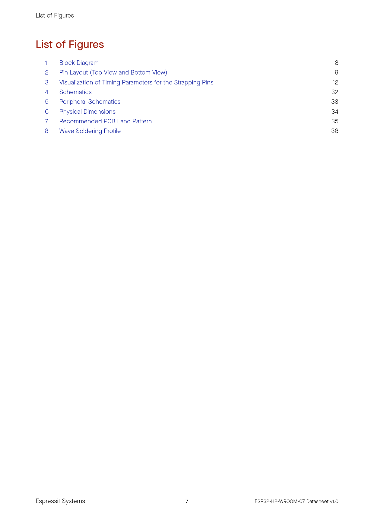 link to page 8 link to page 9 link to page 12 link to page 32 link to page 33 link to page 34 link to page 35 link to page 36 List of Figures List of Figures 1 Block Diagram 8 2 Pin Layout (Top View and Bottom View) 9 3 Visualization of Timing Parameters for the Strapping Pins 12 4 Schematics 32 5 Peripheral Schematics 33 6 Physical Dimensions 34 7 Recommended PCB Land Pattern 35 8 Wave Soldering Profile 36 Espressif Systems 7 ESP32-H2-WROOM-07 Datasheet v1.0 Document Outline 1 Module Overview 1.1 Features 1.2 Series Comparison 1.3 Applications 2 Block Diagram 3 Pin Definitions 3.1 Pin Layout 3.2 Pin Description 4 Boot Configurations 4.1 Chip Boot Mode Control 4.2 ROM Messages Printing Control 4.3 JTAG Signal Source Control 5 Peripherals 5.1 Peripheral Overview 5.2 Peripheral Description 5.2.1 Connectivity Interfaces 5.2.1.1 UART Controller 5.2.1.2 SPI Controller 5.2.1.3 I2C Controller 5.2.1.4 I2S Controller 5.2.1.5 Pulse Count Controller 5.2.1.6 USB Serial/JTAG Controller 5.2.1.7 Two-wire Automotive Interface 5.2.1.8 LED PWM Controller 5.2.1.9 Motor Control PWM 5.2.1.10 Remote Control Peripheral 5.2.1.11 Parallel IO Controller 5.2.2 Analog Signal Processing 5.2.2.1 SAR ADC 5.2.2.2 Temperature Sensor 5.2.2.3 Analog PAD Voltage Comparator 6 Electrical Characteristics 6.1 Absolute Maximum Ratings 6.2 Recommended Operating Conditions 6.3 DC Characteristics (3.3 V, 25 °C) 6.4 Current Consumption Characteristics 6.4.1 Current Consumption in Active Mode 6.4.2 Current Consumption in Other Modes 7 RF Characteristics 7.1 Bluetooth LE Radio 7.1.1 Bluetooth LE RF Transmitter (TX) Characteristics 7.1.2 Bluetooth LE RF Receiver (RX) Characteristics 7.2 802.15.4 Radio 7.2.1 802.15.4 RF Transmitter (TX) Characteristics 7.2.2 802.15.4 RF Receiver (RX) Characteristics 8 Module Schematics 9 Peripheral Schematics 10 Module Dimensions 11 PCB Layout Recommendations 11.1 PCB Land Pattern 11.2 Module Placement for PCB Design 12 Product Handling 12.1 Storage Conditions 12.2 Electrostatic Discharge (ESD) 12.3 Soldering Profile 12.3.1 Wave Profile 12.4 Ultrasonic Vibration Related Documentation and Resources Revision History