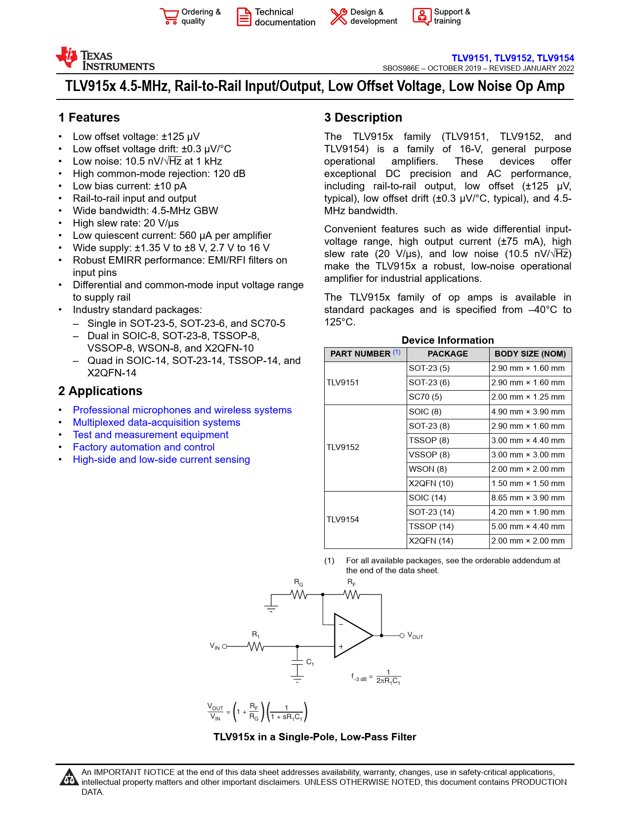 link to page 1 TLV9151,TLV9152,TLV9154 SBOS986E – OCTOBER 2019 – REVISED JANUARY 2022 TLV915x 4.5-MHz, Rail-to-Rail Input/Output, Low Offset Voltage, Low Noise Op Amp1 Features3 Description • Low offset voltage: ±125 µV The TLV915x family (TLV9151, TLV9152, and • Low offset voltage drift: ±0.3 µV/°C TLV9154) is a family of 16-V, general purpose • Low noise: 10.5 nV/√Hz at 1 kHz operational amplifiers. These devices offer • High common-mode rejection: 120 dB exceptional DC precision and AC performance, • Low bias current: ±10 pA including rail-to-rail output, low offset (±125 µV, • Rail-to-rail input and output typical), low offset drift (±0.3 µV/°C, typical), and 4.5- • Wide bandwidth: 4.5-MHz GBW MHz bandwidth. • High slew rate: 20 V/µs Convenient features such as wide differential input- • Low quiescent current: 560 µA per amplifier voltage range, high output current (±75 mA), high • Wide supply: ±1.35 V to ±8 V, 2.7 V to 16 V slew rate (20 V/μs), and low noise (10.5 nV/√Hz) • Robust EMIRR performance: EMI/RFI filters on make the TLV915x a robust, low-noise operational input pins amplifier for industrial applications. • Differential and common-mode input voltage range to supply rail The TLV915x family of op amps is available in • Industry standard packages: standard packages and is specified from –40°C to – Single in SOT-23-5, SOT-23-6, and SC70-5 125°C. – Dual in SOIC-8, SOT-23-8, TSSOP-8, Device Information VSSOP-8, WSON-8, and X2QFN-10 PART NUMBER (1) PACKAGEBODY SIZE (NOM) – Quad in SOIC-14, SOT-23-14, TSSOP-14, and X2QFN-14 SOT-23 (5) 2.90 mm × 1.60 mm TLV9151 SOT-23 (6) 2.90 mm × 1.60 mm 2 Applications SC70 (5) 2.00 mm × 1.25 mm • Professional microphones and wireless systems SOIC (8) 4.90 mm × 3.90 mm • Multiplexed data-acquisition systems SOT-23 (8) 2.90 mm × 1.60 mm • Test and measurement equipment TSSOP (8) 3.00 mm × 4.40 mm • Factory automation and control TLV9152 • High-side and low-side current sensing VSSOP (8) 3.00 mm × 3.00 mm WSON (8) 2.00 mm × 2.00 mm X2QFN (10) 1.50 mm × 1.50 mm SOIC (14) 8.65 mm × 3.90 mm SOT-23 (14) 4.20 mm × 1.90 mm TLV9154 TSSOP (14) 5.00 mm × 4.40 mm X2QFN (14) 2.00 mm × 2.00 mm (1) For all available packages, see the orderable addendum at the end of the data sheet. R R G F R1 VOUT VIN C1 1 f = -3 dB 2pR C 1 1 V R OUT F 1 = 1 + ( V R IN G 1 + sR C 1 1 TLV915x in a Single-Pole, Low-Pass Filter An IMPORTANT NOTICE at the end of this data sheet addresses availability, warranty, changes, use in safety-critical applications, intellectual property matters and other important disclaimers. UNLESS OTHERWISE NOTED, this document contains PRODUCTION DATA. Document Outline 1 Features 2 Applications 3 Description Table of Contents 4 Revision History 5 Pin Configuration and Functions 6 Specifications 6.1 Absolute Maximum Ratings 6.2 ESD Ratings 6.3 Recommended Operating Conditions 6.4 Thermal Information for Single Channel 6.5 Thermal Information for Dual Channel 6.6 Thermal Information for Quad Channel 6.7 Electrical Characteristics 6.8 Typical Characteristics 7 Detailed Description 7.1 Overview 7.2 Functional Block Diagram 7.3 Feature Description 7.3.1 EMI Rejection 7.3.2 Thermal Protection 7.3.3 Capacitive Load and Stability 7.3.4 Common-Mode Voltage Range 7.3.5 Phase Reversal Protection 7.3.6 Electrical Overstress 7.3.7 Overload Recovery 7.3.8 Typical Specifications and Distributions 7.3.9 Packages With an Exposed Thermal Pad 7.3.10 Shutdown 7.4 Device Functional Modes 8 Application and Implementation 8.1 Application Information 8.2 Typical Applications 8.2.1 Low-Side Current Measurement 8.2.1.1 Design Requirements 8.2.1.2 Detailed Design Procedure 8.2.1.3 Application Curves 9 Power Supply Recommendations 10 Layout 10.1 Layout Guidelines 10.2 Layout Example 11 Device and Documentation Support 11.1 Device Support 11.1.1 Development Support 11.1.1.1 TINA-TI™ (Free Software Download) 11.1.1.2 TI Precision Designs 11.2 Documentation Support 11.2.1 Related Documentation 11.3 Receiving Notification of Documentation Updates 11.4 Support Resources 11.5 Trademarks 11.6 Electrostatic Discharge Caution 11.7 Glossary 12 Mechanical, Packaging, and Orderable Information