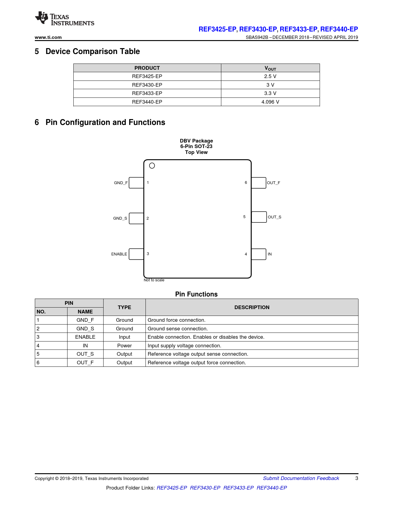 REF3425-EP. , REF3430-EP,. REF3433-EP,. REF3440-EP. www.ti.com. 5 Device Comparison Table. PRODUCT. VOUT