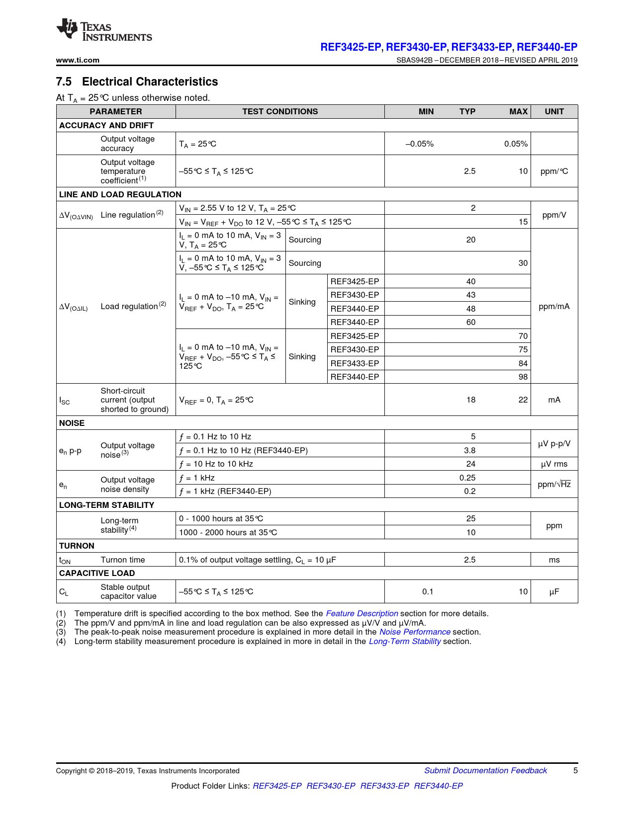 REF3425-EP. , REF3430-EP,. REF3433-EP,. REF3440-EP. www.ti.com. 7.5 Electrical Characteristics. PARAMETER. TEST CONDITIONS. MIN. TYP. MAX
