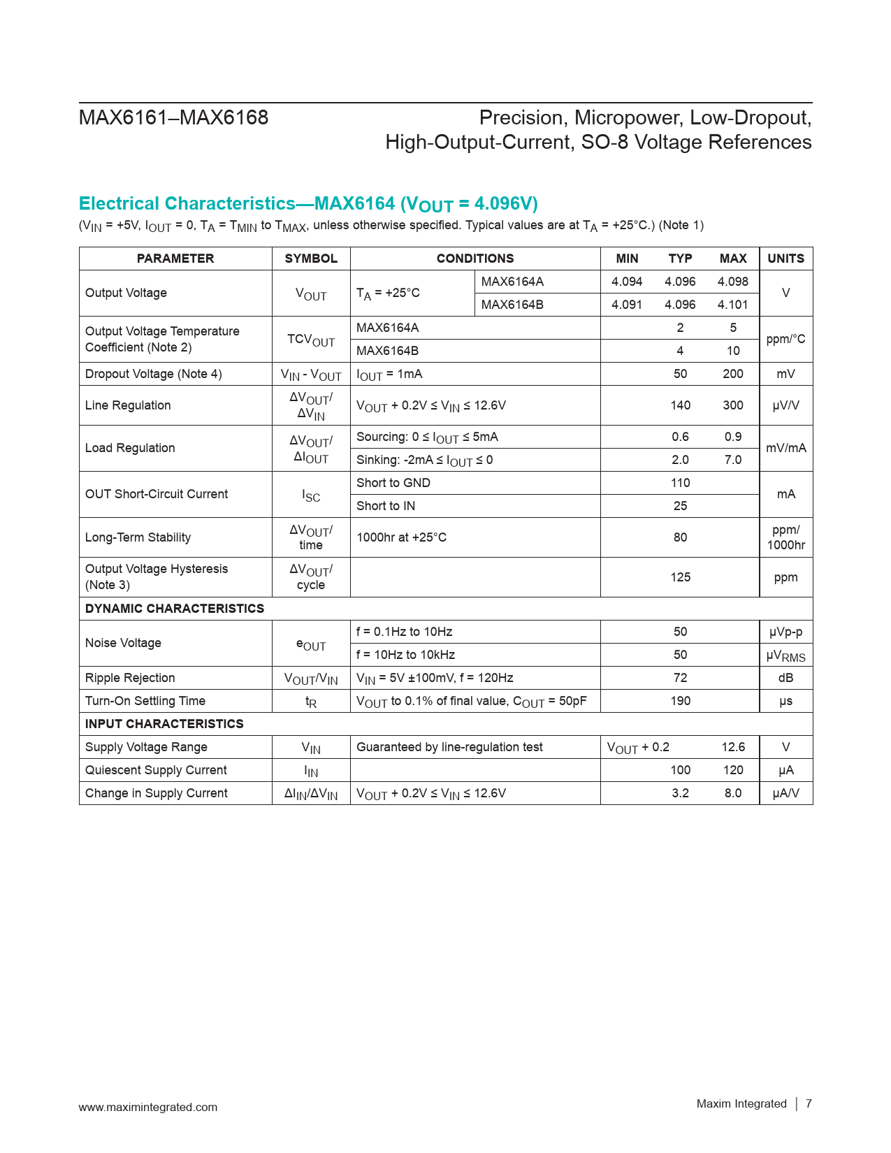 Electrical Characteristics—MAX6164 (VOUT = 4.096V). PARAMETER. SYMBOL. CONDITIONS. MIN. TYP. MAX. UNITS. DYNAMIC CHARACTERISTICS