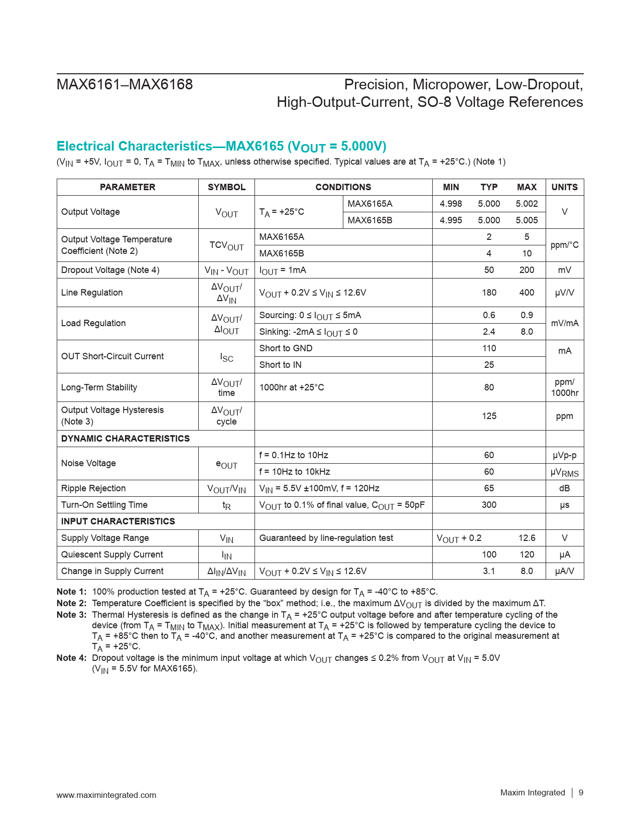 MAX6161–MAX6168 Precision, Micropower, Low-Dropout, High-Output-Current, SO-8 Voltage References Electrical Characteristics—MAX6165 (VOUT = 5.000V) (VIN = +5V, IOUT = 0, TA = TMIN to TMAX, unless otherwise specified. Typical values are at TA = +25°C.) (Note 1) PARAMETERSYMBOLCONDITIONSMINTYPMAXUNITS MAX6165A 4.998 5.000 5.002 Output Voltage VOUT TA = +25°C V MAX6165B 4.995 5.000 5.005 Output Voltage Temperature MAX6165A 2 5 Coefficient (Note 2) TCVOUT ppm/°C MAX6165B 4 10 Dropout Voltage (Note 4) VIN - VOUT IOUT = 1mA 50 200 mV Line Regulation ΔVOUT/ ΔV VOUT + 0.2V ≤ VIN ≤ 12.6V 180 400 µV/V IN Sourcing: 0 ≤ I Load Regulation ΔVOUT/ OUT ≤ 5mA 0.6 0.9 ΔI mV/mA OUT Sinking: -2mA ≤ IOUT ≤ 0 2.4 8.0 Short to GND 110 OUT Short-Circuit Current I mA SC Short to IN 25 Long-Term Stability ΔVOUT/ time 1000hr at +25°C 80 ppm/ 1000hr Output Voltage Hysteresis ΔVOUT/ (Note 3) cycle 125 ppm DYNAMIC CHARACTERISTICS f = 0.1Hz to 10Hz 60 µVp-p Noise Voltage eOUT f = 10Hz to 10kHz 60 µVRMS Ripple Rejection VOUT/VIN VIN = 5.5V ±100mV, f = 120Hz 65 dB Turn-On Settling Time tR VOUT to 0.1% of final value, COUT = 50pF 300 µs INPUT CHARACTERISTICS Supply Voltage Range VIN Guaranteed by line-regulation test VOUT + 0.2 12.6 V Quiescent Supply Current IIN 100 120 µA Change in Supply Current ΔIIN/ΔVIN VOUT + 0.2V ≤ VIN ≤ 12.6V 3.1 8.0 µA/V Note 1: 100% production tested at TA = +25°C. Guaranteed by design for TA = -40°C to +85°C. Note 2: Temperature Coefficient is specified by the “box” method; i.e., the maximum ΔVOUT is divided by the maximum ΔT. Note 3: Thermal Hysteresis is defined as the change in TA = +25°C output voltage before and after temperature cycling of the device (from TA = TMIN to TMAX). Initial measurement at TA = +25°C is followed by temperature cycling the device to TA = +85°C then to TA = -40°C, and another measurement at TA = +25°C is compared to the original measurement at TA = +25°C. Note 4: Dropout voltage is the minimum input voltage at which VOUT changes ≤ 0.2% from VOUT at VIN = 5.0V (VIN = 5.5V for MAX6165). www.maximintegrated.com Maxim Integrated │ 9