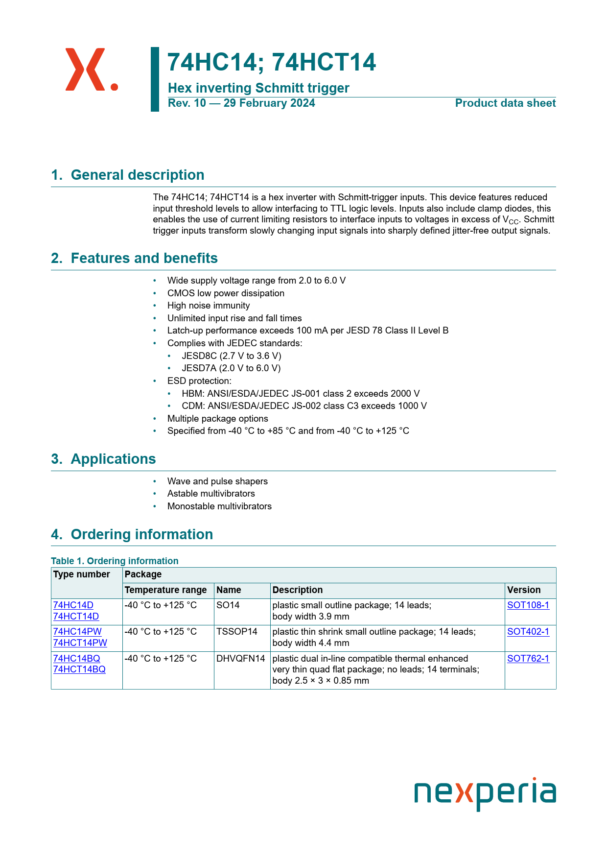 74HC14; 74HCT14 Hex inverting Schmitt trigger Rev. 10 — 29 February 2024 Product data sheet 1. General description