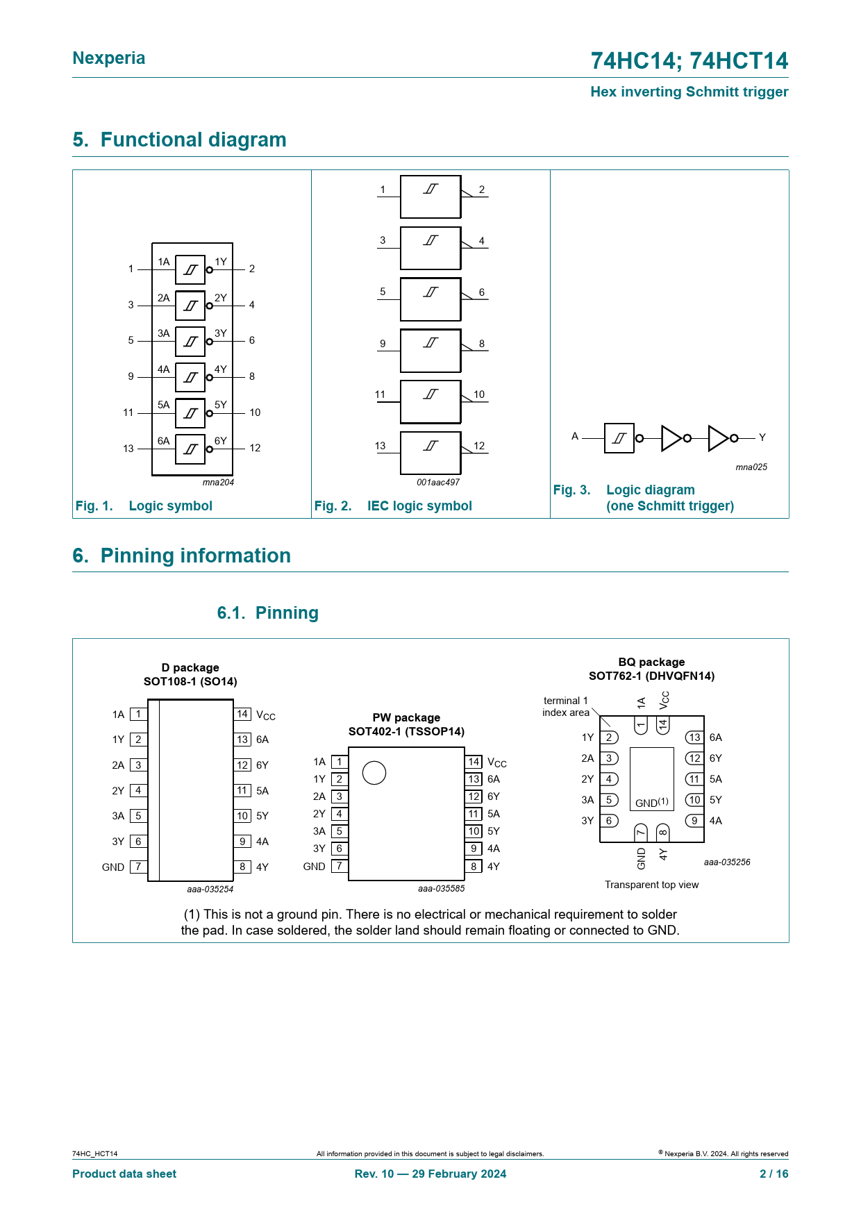 1 14 1Y 2 13 6A 1Y 2 13 6A 3 12 2A 3 12 6Y 1A 1 14 V 2A 6Y CC 1Y 2 13 6A 2Y 4 11 5A 2Y 4 11 5A 2A 3 12 6Y 3A 5 10 5Y GND(1) 3A 5 10 5Y 2Y 4 11 5A 3Y 6 9 4A 3A 5 10 5Y 7 8 3Y 6 9 4A 3Y 6 9 4A D N 4Y GND 7 8 4Y GND 7 8 4Y aaa-035256 G aaa-035254 aaa-035585 Transparent top view (1) This is not a ground pin. There is no electrical or mechanical requirement to solder the pad. In case soldered, the solder land should remain floating or connected to GND. 74HC_HCT14 All information provided in this document is subject to legal disclaimers. © Nexperia B.V. 2024. Al rights reserved