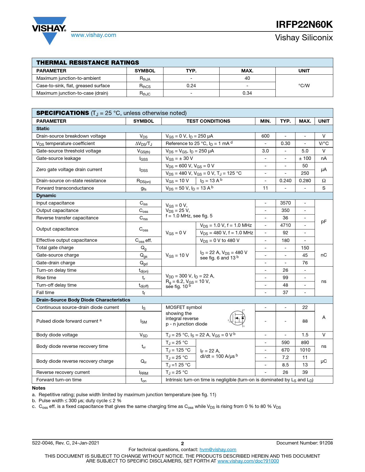 IRFP22N60K. THERMAL RESISTANCE RATINGS PARAMETER SYMBOL. TYP. MAX. UNIT. SPECIFICATIONS. PARAMETER SYMBOL. TEST. CONDITIONS. MIN. Static