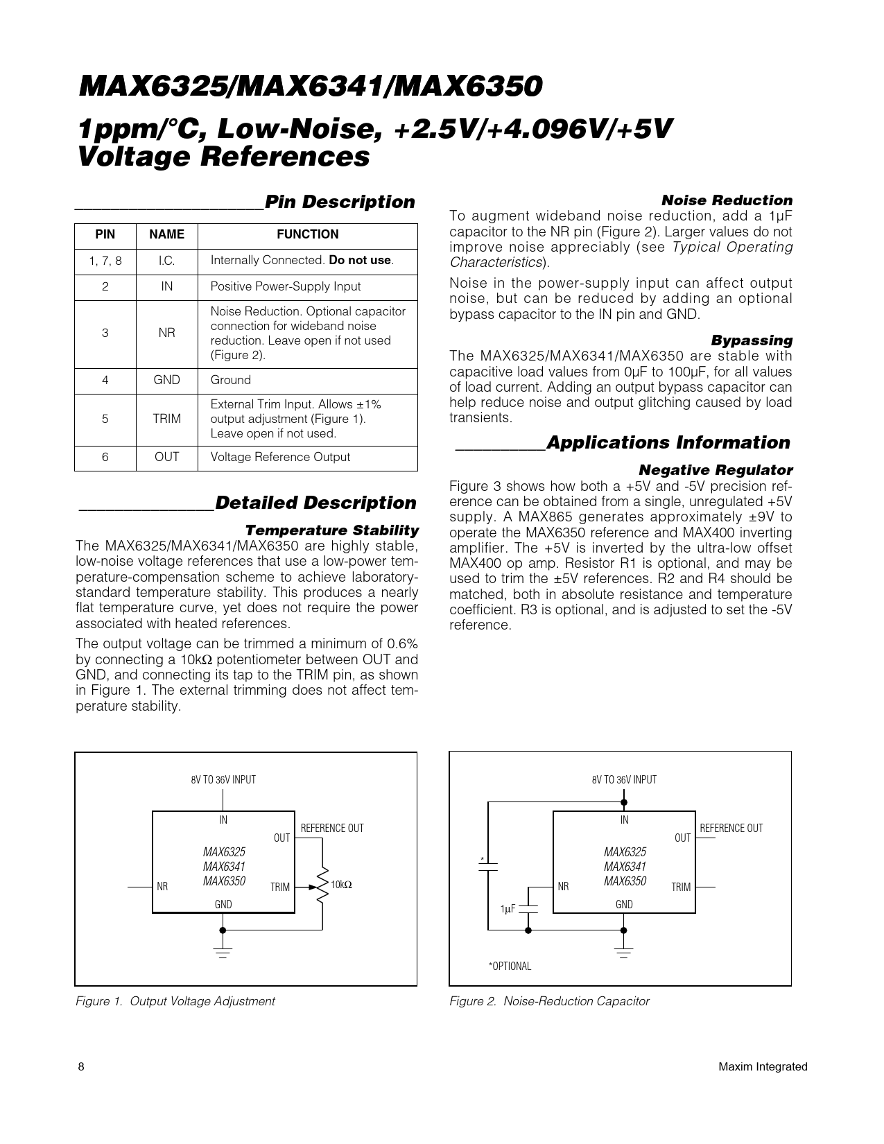 MAX6325/MAX6341/MAX6350 MAX6325/MAX6341/MAX6350 1ppm/°C, Low-Noise, +2.5V/+4.096V/+5V Voltage References_____________________Pin DescriptionNoise Reduction To augment wideband noise reduction, add a 1µF capacitor to the NR pin (Figure 2). Larger values do not PINNAMEFUNCTION improve noise appreciably (see Typical Operating 1, 7, 8 I.C. Internally Connected. Do not use . Characteristics). 2 IN Positive Power-Supply Input Noise in the power-supply input can affect output noise, but can be reduced by adding an optional Noise Reduction. Optional capacitor bypass capacitor to the IN pin and GND. connection for wideband noise 3 NR reduction. Leave open if not used Bypassing (Figure 2). The MAX6325/MAX6341/MAX6350 are stable with capacitive load values from 0µF to 100µF, for all values 4 GND Ground of load current. Adding an output bypass capacitor can External Trim Input. Allows ±1% help reduce noise and output glitching caused by load 5 TRIM output adjustment (Figure 1). transients. Leave open if not used. __________Applications Information 6 OUT Voltage Reference Output Negative Regulator Figure 3 shows how both a +5V and -5V precision ref- _______________Detailed Description erence can be obtained from a single, unregulated +5V supply. A MAX865 generates approximately ±9V to Temperature Stability operate the MAX6350 reference and MAX400 inverting The MAX6325/MAX6341/MAX6350 are highly stable, amplifier. The +5V is inverted by the ultra-low offset low-noise voltage references that use a low-power tem- MAX400 op amp. Resistor R1 is optional, and may be perature-compensation scheme to achieve laboratory- used to trim the ±5V references. R2 and R4 should be standard temperature stability. This produces a nearly matched, both in absolute resistance and temperature flat temperature curve, yet does not require the power coefficient. R3 is optional, and is adjusted to set the -5V associated with heated references. reference. The output voltage can be trimmed a minimum of 0.6% by connecting a 10kΩ potentiometer between OUT and GND, and connecting its tap to the TRIM pin, as shown in Figure 1. The external trimming does not affect tem- perature stability. 8V TO 36V INPUT 8V TO 36V INPUT IN IN REFERENCE OUT REFERENCE OUT OUT OUT MAX6325 MAX6325 MAX6341 * MAX6341 MAX6350 MAX6350 NR TRIM 10kΩ NR TRIM GND 1µF GND *OPTIONAL Figure 1. Output Voltage Adjustment Figure 2. Noise-Reduction Capacitor 8 Maxim Integrated