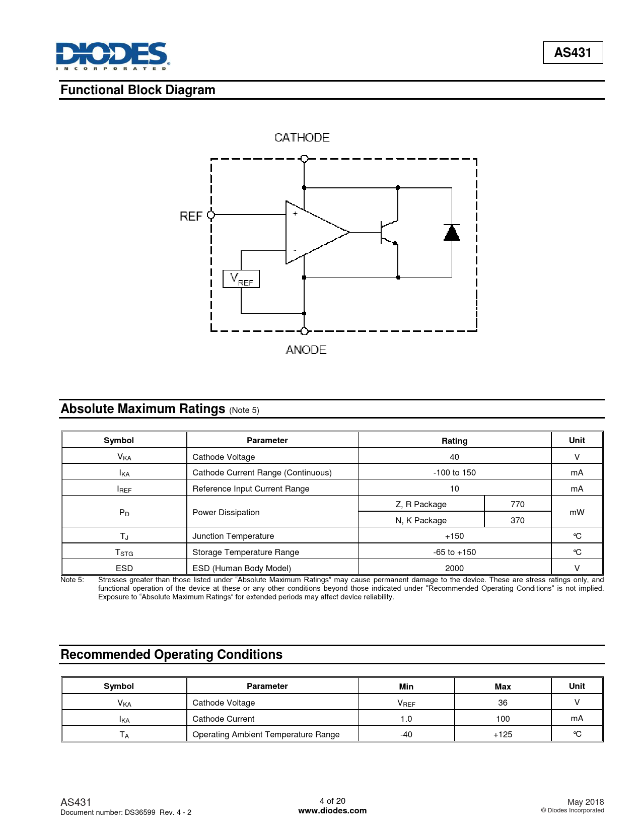 VKA Cathode Voltage VREF 36 V IKA Cathode Current 1.0 100 mA TA Operating Ambient Temperature Range -40 +125 °C AS431 4 of 20 May 2018 Document number: DS36599 Rev. 4 - 2
