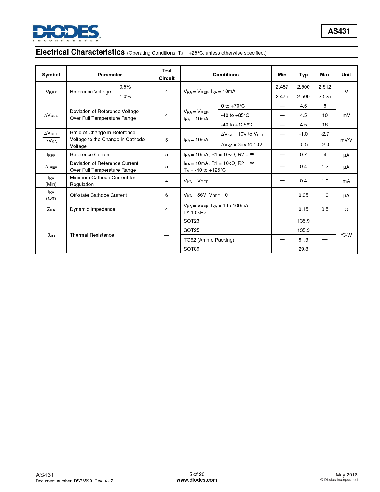 AS431. Electrical Characteristics. Test. Symbol. Parameter. Conditions. Min. Typ. Max. Unit. Circuit. www.diodes.com